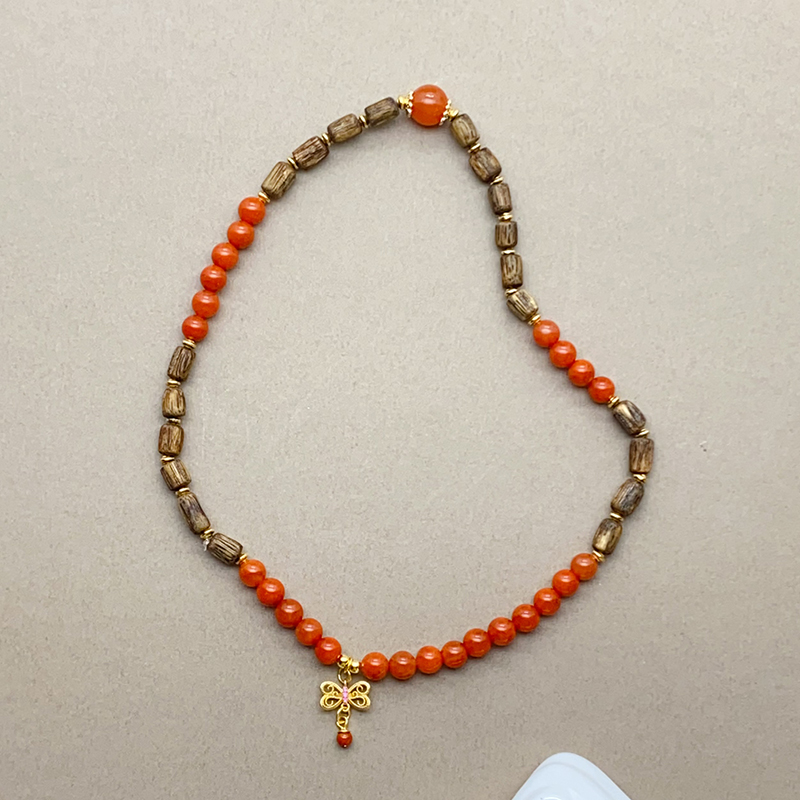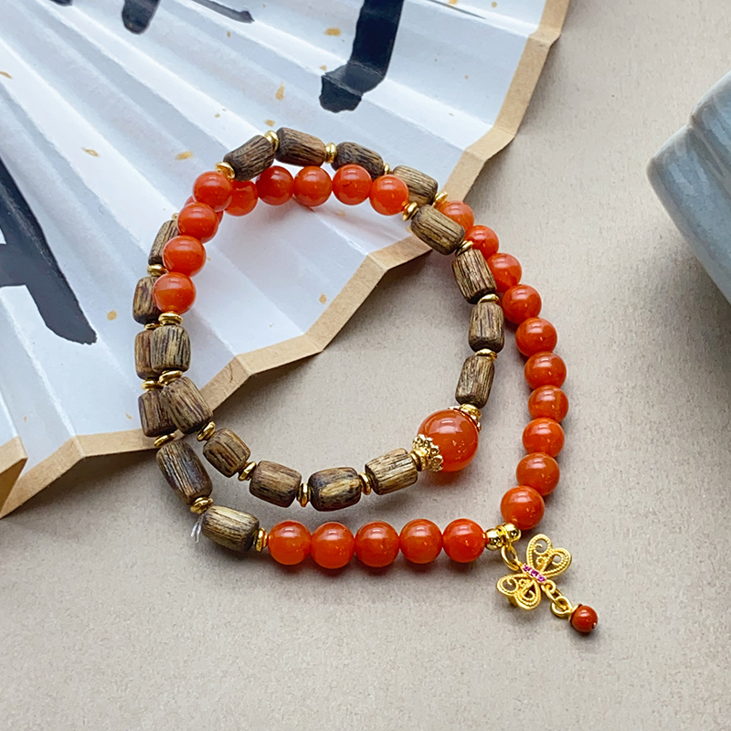 奇楠沉香手串 国产奇楠桶珠配南红双圈 6mm