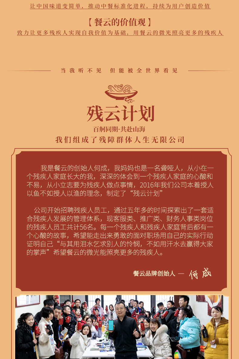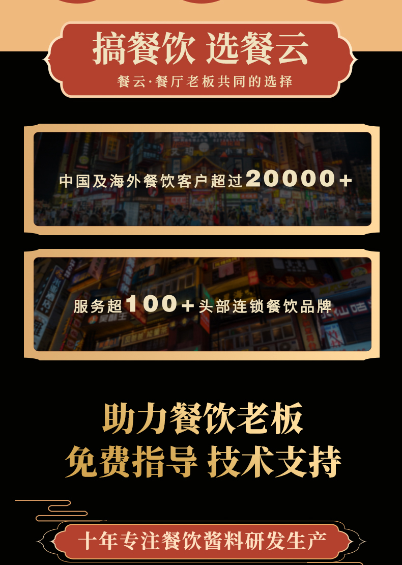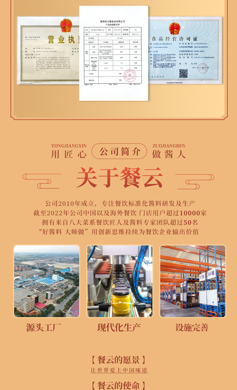 - 十年专注餐饮标准化酱料研发,中国及海外餐饮门店用户超过8000家,一种撬动厨房变革的全新价值主张,为餐饮节约30%人工成本。