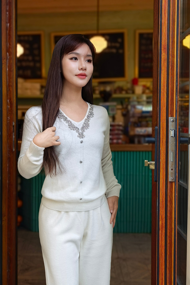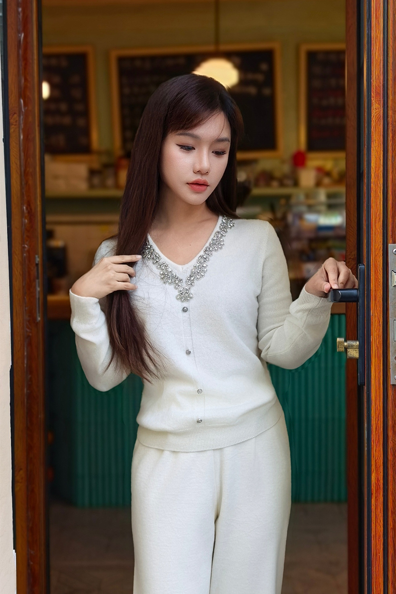 米白色的温润能带出羊绒的柔软质感,是冬日里的奶油暖阳,温柔到骨子里。它最能把钻链的璀璨衬托得淋漓尽致,自带柔光滤镜,是气质挂美女的首选,搭配浅色系大衣,完美诠释什么叫“富家千金”氛围感。