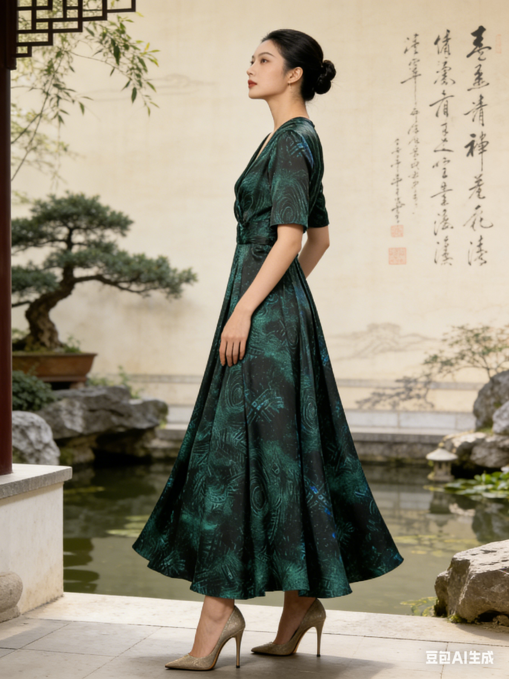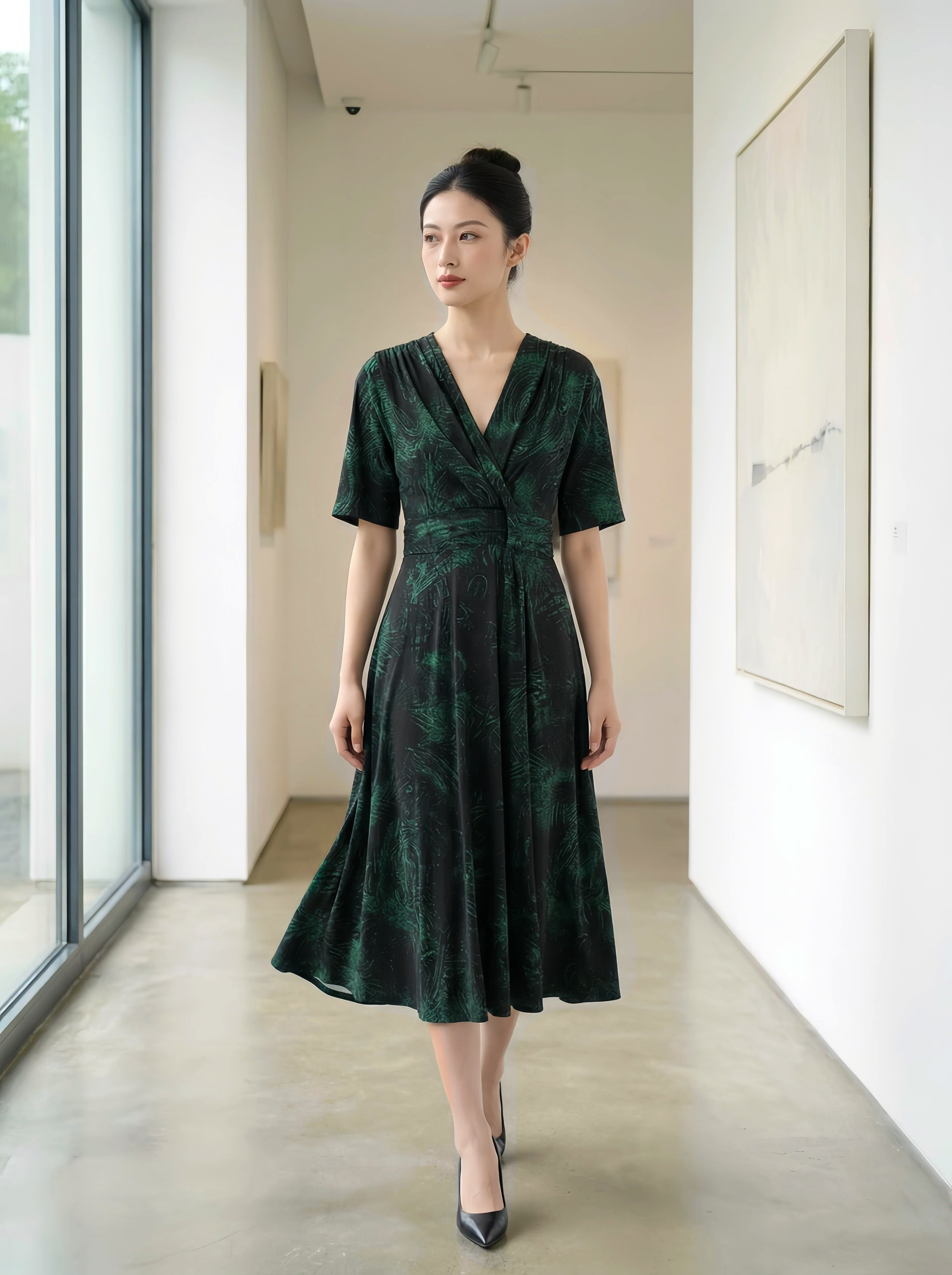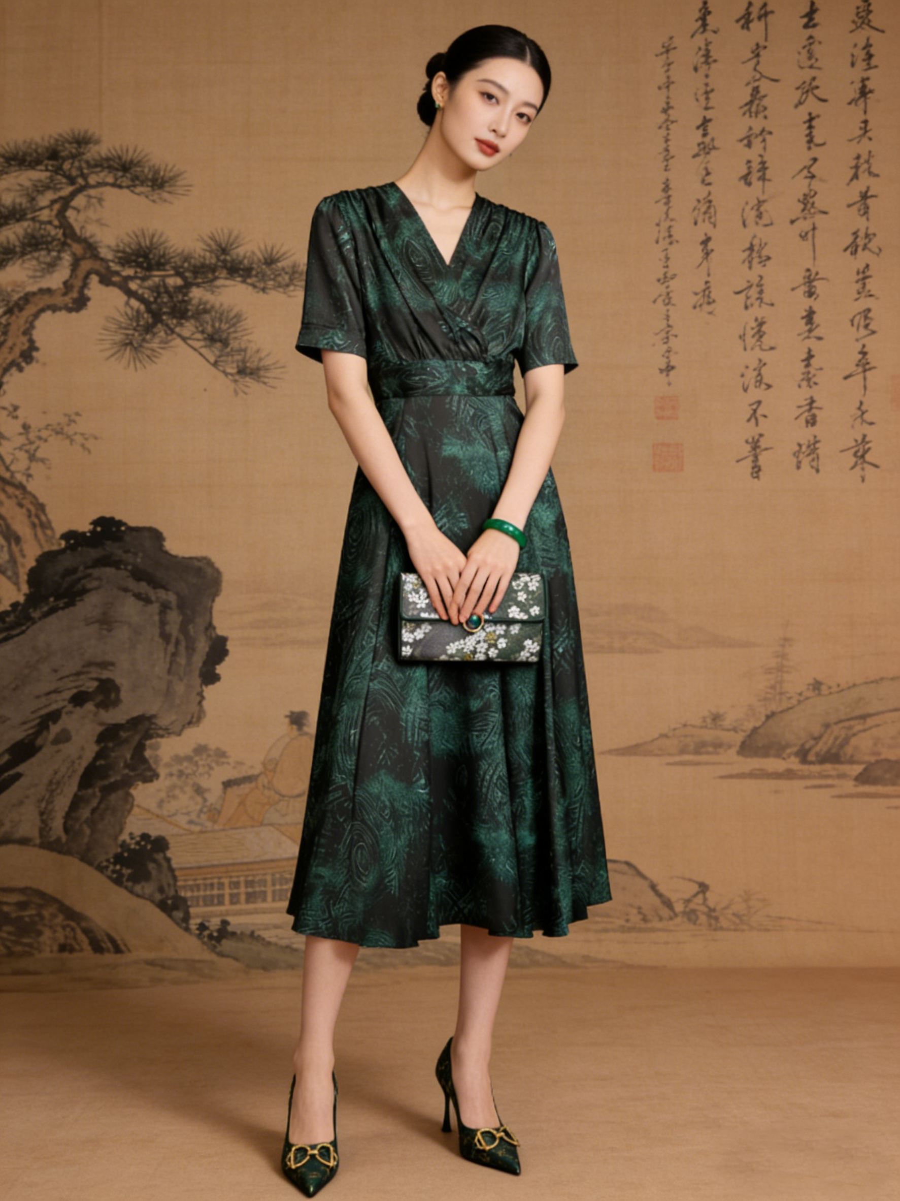 黑色基底沉稳显瘦,祖母绿(墨绿)自带贵气与复古感,暗纹提花 / 印花设计低调不张扬,远看是高级纯色,近看细节满满,完美契合品牌 “精致贵气” 的调性;