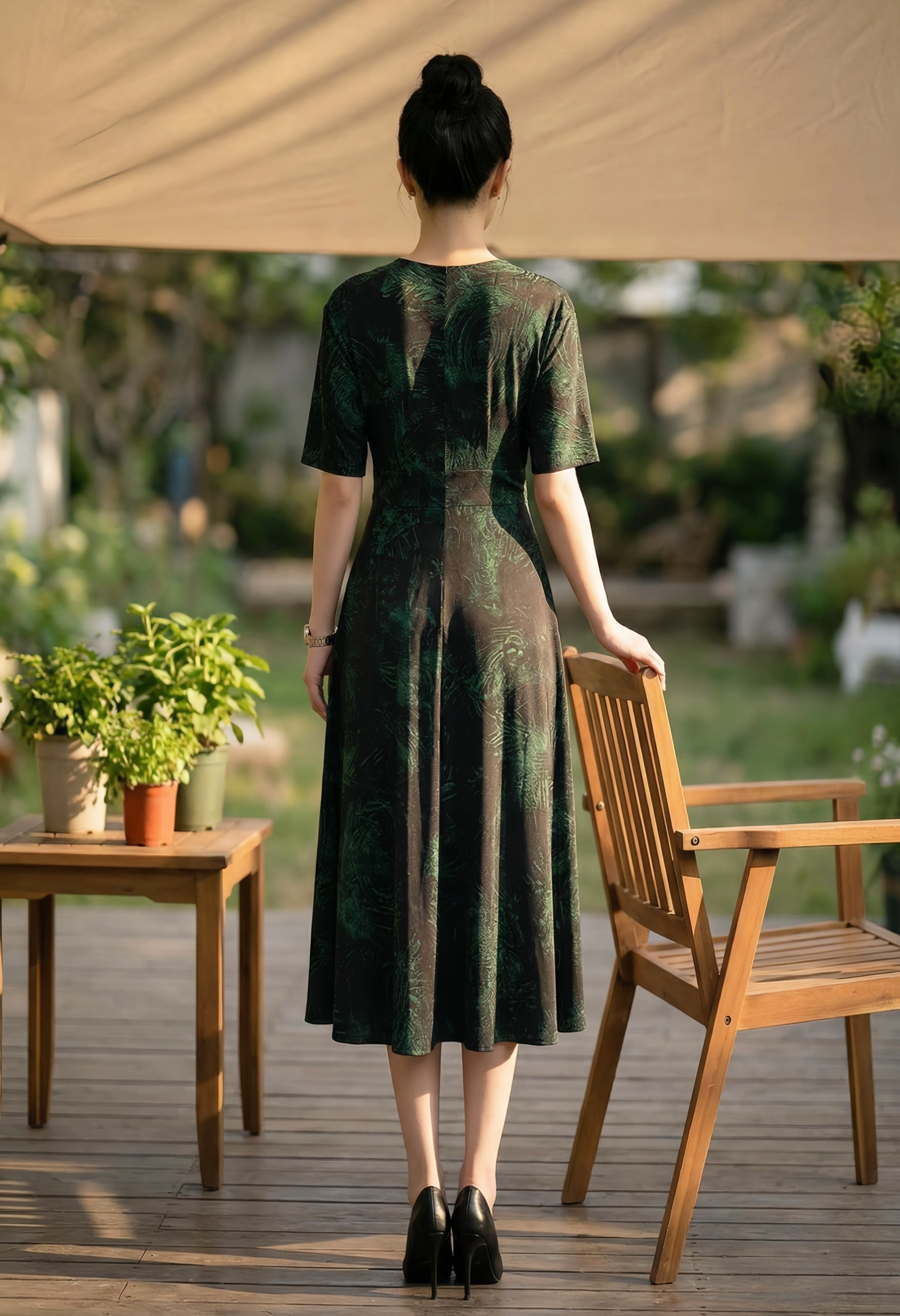 中袖(蝙蝠袖 / 落肩袖)剪裁,修饰手臂拜拜肉,兼顾得体与舒适。A 字大摆中长裙:长度到小腿中部,是最显优雅、不挑腿型的黄金长度,行走间自带垂坠感,遮盖胯宽、腿粗,同时保留灵动气质。