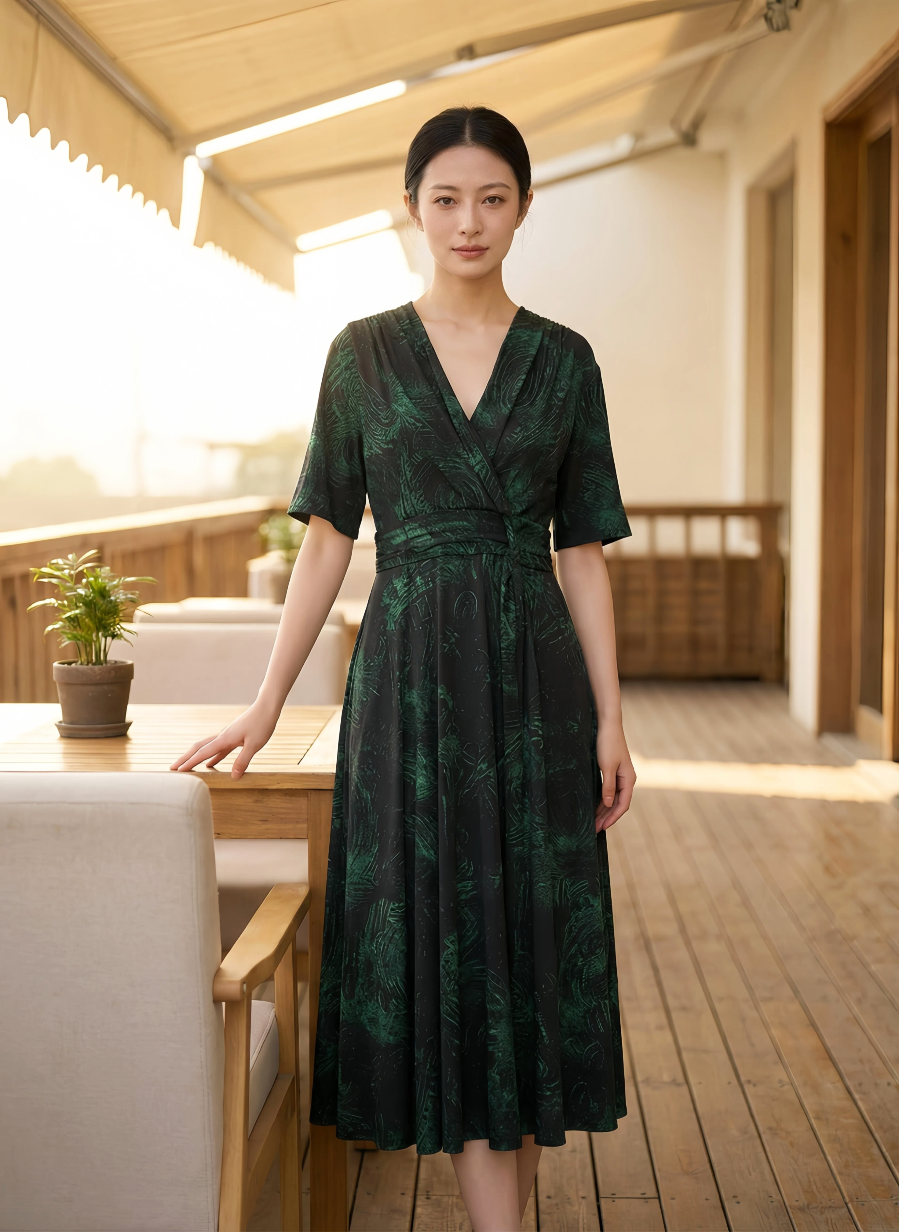 V领围裹式设计:经典的交叉 V 领 + 腰封式收腰,是修饰身材的 “黄金版型”:拉长颈部线条,优化头肩比,弱化肩宽、副乳等问题;高腰线设计瞬间拉高比例,打造 “三七分” 身材,对腰腹有赘肉、梨形身材的包容度极高;