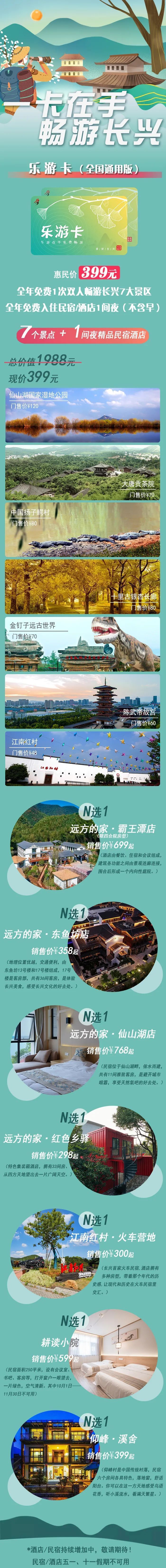 399乐游卡仅限本人使用,有效期为2020年4月1日-2020年12月31日,有效期内免费1次畅游长兴7大景区(同行1人免费游景区)有效期内免费入住民宿/酒店1间夜(不含早)。