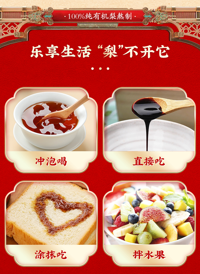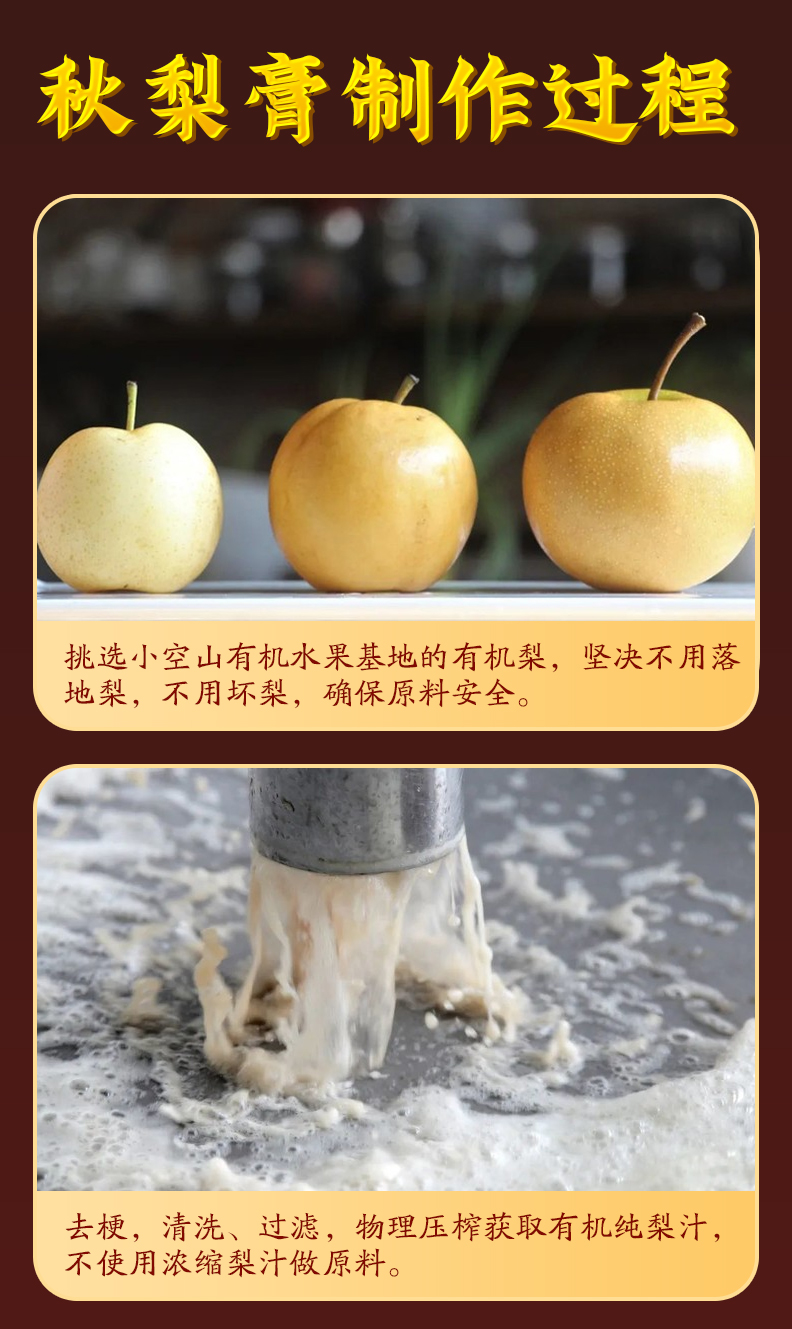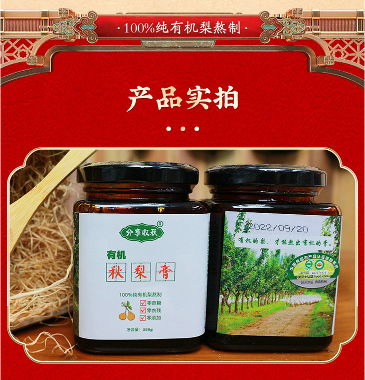 有机秋梨膏 规格: 有机秋梨膏(木盒装 加糖)250g/瓶 有机秋梨膏(木盒装 无糖)250g/瓶 配料: 有机秋梨膏(无糖):有机梨 有糖秋梨膏(加糖):有机梨、有机白砂糖 生产许可证:SC11713013300341 执行标准:Q/XXSP 0002S 保质期:24个月 生产日期:见包装 储藏方法:密封避光、常温存放 产品特色: 15斤有机梨熬一斤膏;不用落地梨;不添加其它非有机原料;不添加任何的水、增稠剂、防腐剂、香精、甜味剂等; 食用方法: 冲水喝、口服、冲牛奶、拌沙拉、蘸面包等 说明: 无糖版的秋梨膏原料只有有机梨,有梨子原本的果香,口感微酸一些。 有糖版秋梨膏为了平衡秋梨膏本身的微酸,加糖比例在15~20%,口感偏甜一些。 发货方式:分享收获柳庄户基地发货。早上7点前下单,当日发货,早上7点以后下单,次日发货,加急联系客服18610230279 |