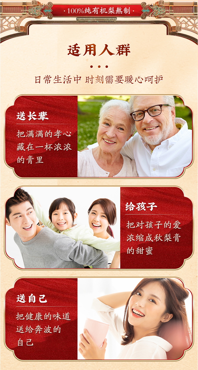 关于适合人群:有机秋梨膏属于食品,食品不可替代药品。