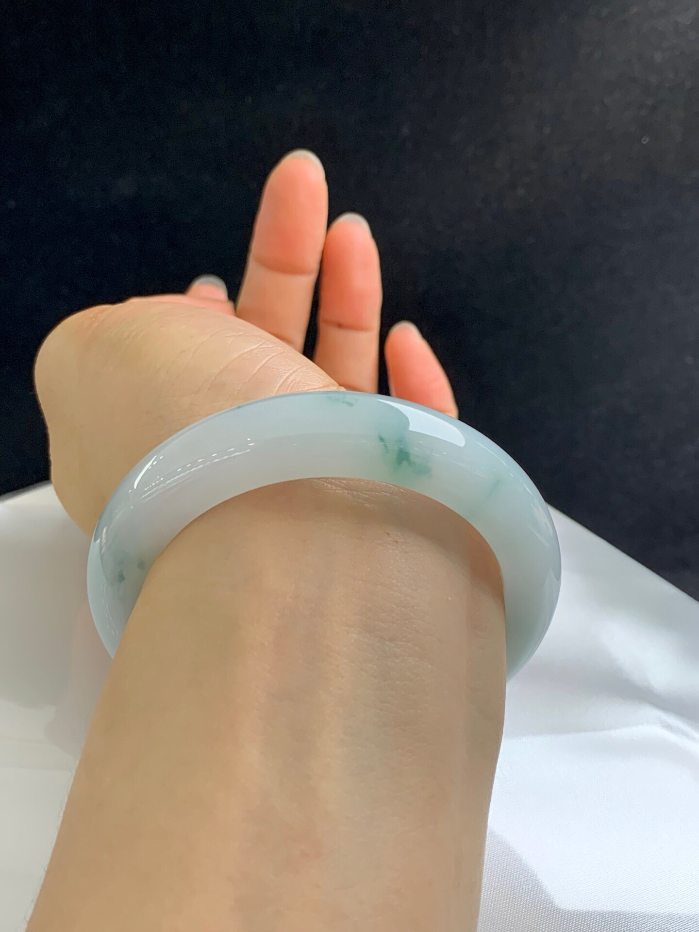 620647,55圈口,糯化飘花正圈平安镯,白底飘蓝花,底子非常细润,清爽干净