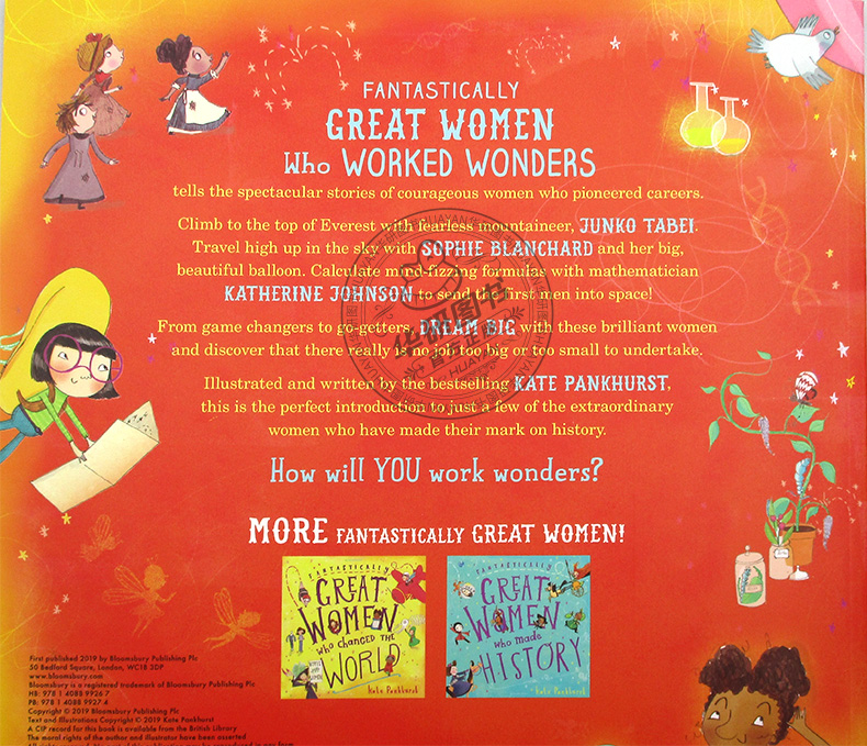 《改变世界的伟大女性》、《创造历史的伟大女性》在英国创下了100,000册的销售佳绩,登上网络书店童书榜的前列,并且授予多国版权。现在,英国童书作家Kate Pankhurst再次以同样充满活力的美丽插图,以及幽默诙谐的文字,创作了Fantastically Great Women Who Worked Wonders《创造奇迹的伟大女性》一书,向孩子们介绍世界上许多创造佳话的伟大女性形象。 书中介绍的女性包括,登上了珠穆朗玛峰的日本登山运动员田部井淳子(Junko Tabei)、德国昆虫专家和画家玛丽亚·梅里安(Maria Merian)、“大富翁”游戏的发明者伊丽莎白·玛吉(Elizabeth Magie)、知名童书作家罗莎·梅·比林赫斯特(Rosa May Billinghurst)、航空航天科学家凯瑟琳·约翰逊(Katherine Johnson)等。透过有趣的故事以及生平趣闻,让孩子们更加了解这些女性对世界做出的巨大贡献! Kate Pankhurst, descendent of Emmeline Pankhurst, is back with a brand new wildly brilliant and accessible book about incredible women in the world of work. What do you want to be when you grow up? It's a BIG question that everyone is asked from an early age. Discover eye-opening facts about a collection of go-getting women who have pioneered careers in a kaleidoscope of different industries. Join scientists, doctors, athletes, hot-air balloonists and more, journey back in time with these brave, bold and brilliant women and discover that anything is possible when you make the most of YOUR talents. Prepare yourself for a celebration of women who opened doors and made it possible for more women to achieve amazing things today. Overflowing with beautiful illustrations and astounding facts, Fantastically Great Women Who Worked Wonders is the perfect introduction to just a few of the most incredible women who helped shaped the world we live in. List of women featured: Junko Tabei, Sophie Blanchard, Maria Merian, Elizabeth Magie, the London Matchgirls, Rosa May Billinghurst, Katherine Johnson, Annette Kellerman, Katia Krafft, Rosalind Franklin, James Barry, Madam C.J. Walker, Lotte Reiniger. Review “It's impossible not to be inspired by this book, written by a descendent of Emmeline Pankhurst, and the great women featured in it. Their stories are told across bright spreads, which are packed with information that will make readers excited about the remarkable achievements described.” (Absolutely Education) “This book should be available in every school and every library and is sure to inspire young people to follow their hearts.” (Acorn Books) “An absolute must-have for every young person's bookshelf.” (The Huffington Post) “This book which is a must have for anybody - girl or boy, man or woman - it's enlightening for one and all . it's celebratory.”(Books for Keeps)