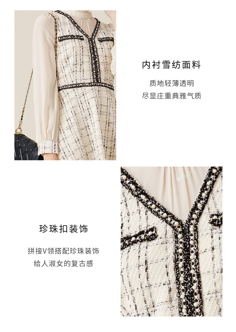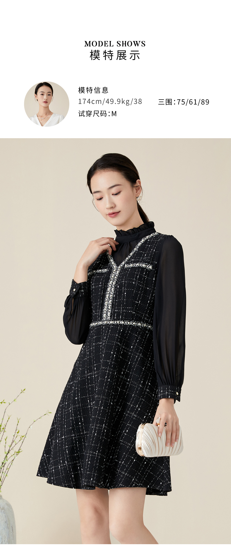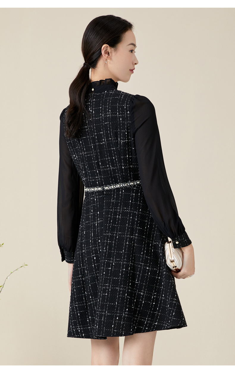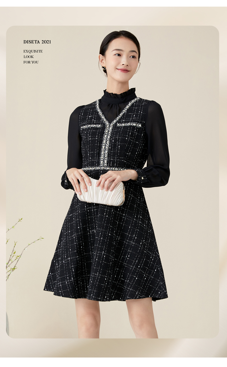 玳莎小香风气质长袖连衣裙秋冬新款A字裙小立领拼接中长款裙子 BD35303