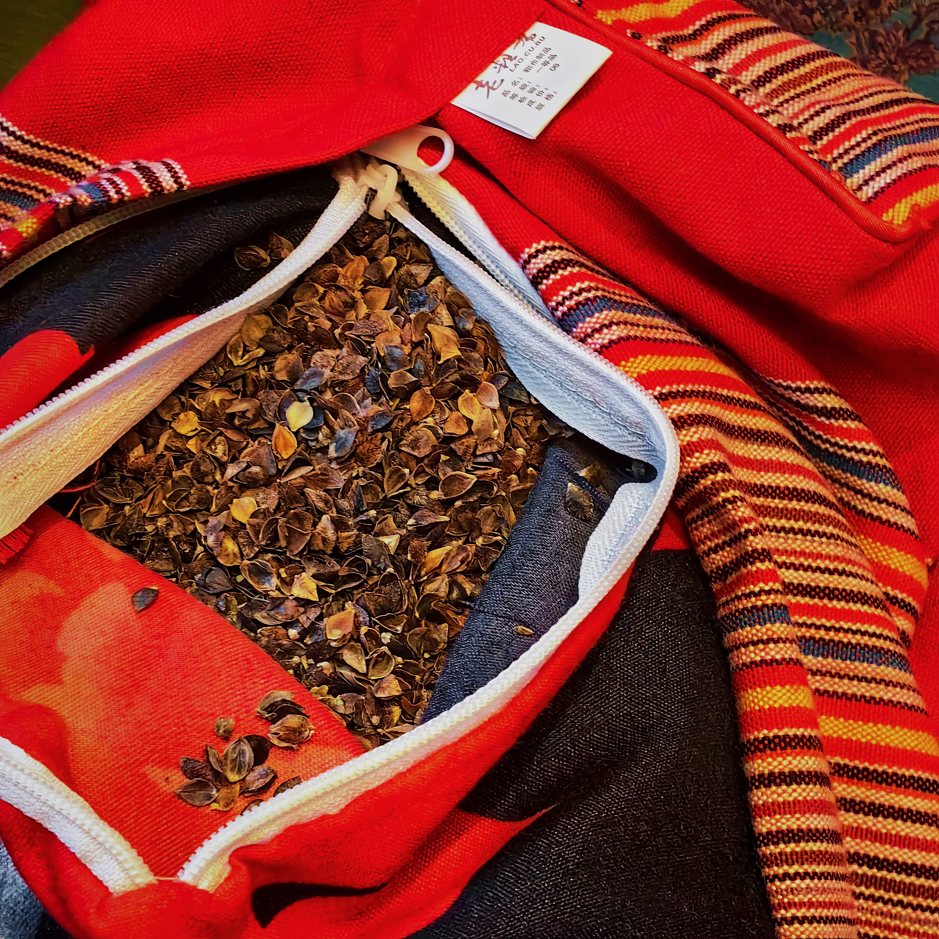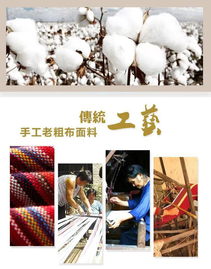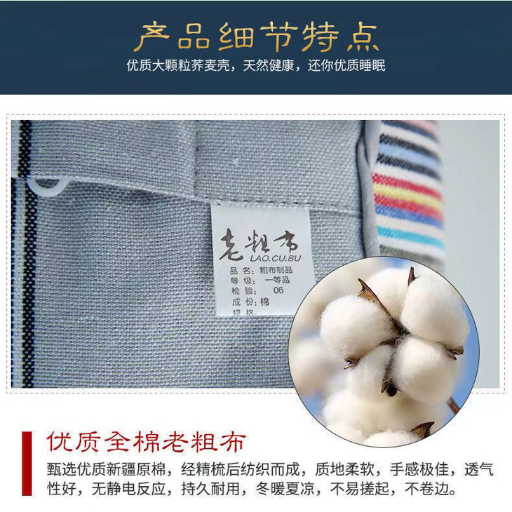 老粗布又称鲁锦,在2008年认定为非物质文化遗产,因“图案色彩绚丽,美丽如锦”而得名。而荞麦,既能做粮食,药用价值也很高,《本草纲目》记载:“荞麦壳做枕,明目爽神,舒筋活络。”荞麦壳独特的构造,具有良好的透气性,永不变形,可塑性强,冬暖夏凉,它的中空结构,睡眠中人体排出的汗液、湿气,都能很好地挥散,而且气味清爽,是天然适合做枕芯的材质之一。