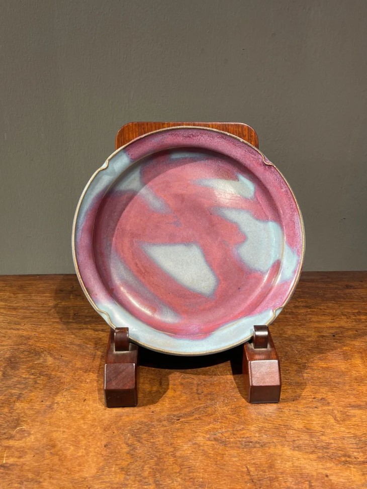 这是一件仿宋代文玩风格瓷器造型的紫斑天青釉钧窑折沿盘,艳丽的紫红天青色钧窑釉,点缀浑然天成的蚯蚓走泥纹,鲜艳夺目的紫红斑窑变钧窑釉泼洒自然,真正体现“入窑一色、出窑万彩”的窑变钧窑釉的特点。属人见人爱的仿宋代风格钧窑折沿盘。此紫斑天青釉钧窑折沿盘,典雅四瓣花口折沿盘,三足盆造型,除圈足内五个支钉处露灰胎外,通体施紫红天青釉,艳丽钧窑釉色自然晕染、色调浑然天成,非人为可控制的天然窑变釉精彩雅緻。此紫斑天青釉钧窑折沿盘,应是仿宋陶瓷佳作,当时此类仿宋代钧瓷制作严谨,造型依循古器,釉色仿宋钧釉极其到位。如此艳丽优雅的仿宋紫斑天青釉钧窑折沿盘,是精美的案头摆设与实用的果子盘,高贵典雅,肯定是让宾客印象深刻之精美陶瓷藏品。此紫斑天青釉钧窑折沿盘,除釉表面轻微磨损痕迹外,保持良好。尺寸:直径:21.5厘米;底部直径:13.0厘米;高度:3.5厘米;重量:604克