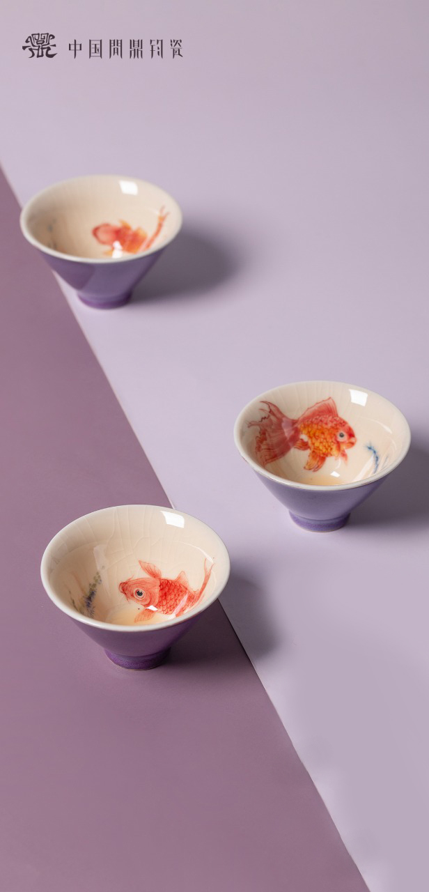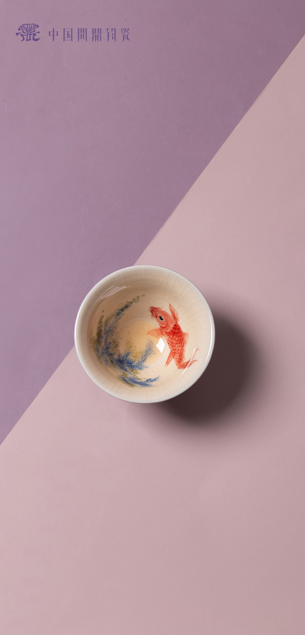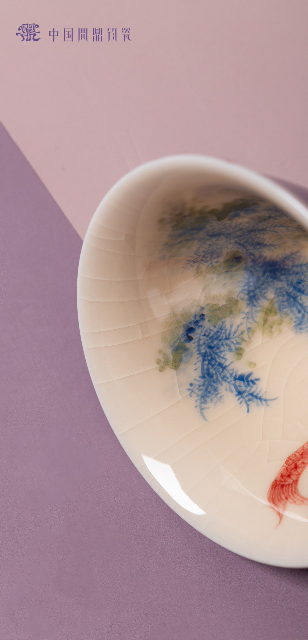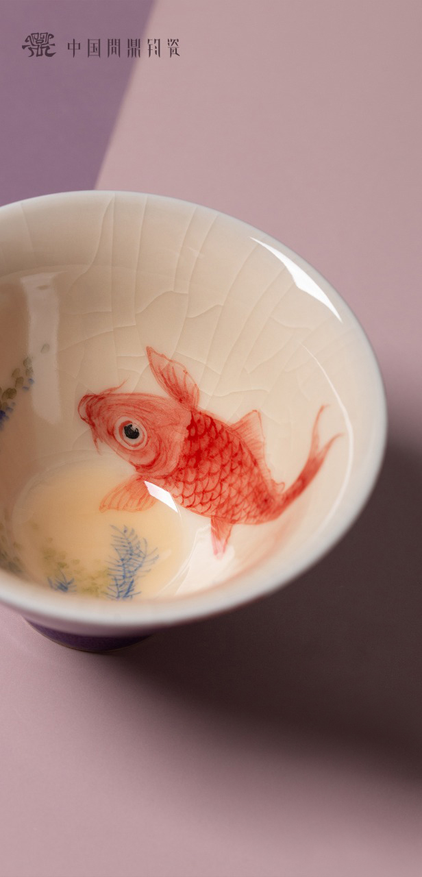 问鼎钧瓷鹅黄青花斗笠杯(清波锦鲤)