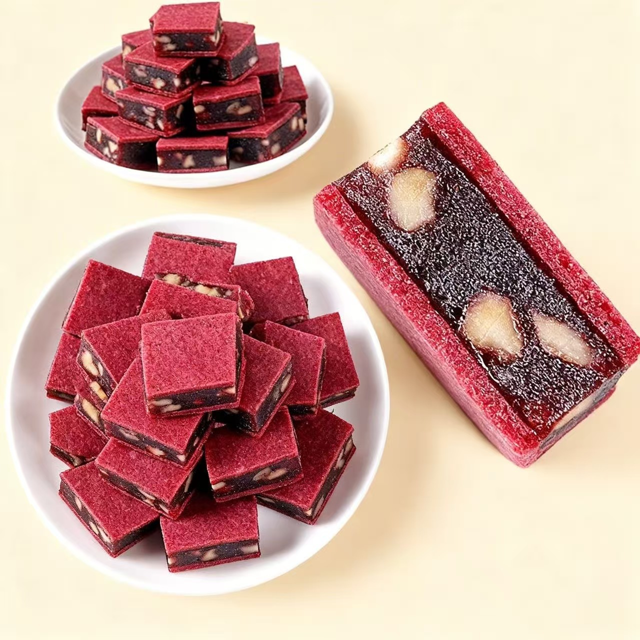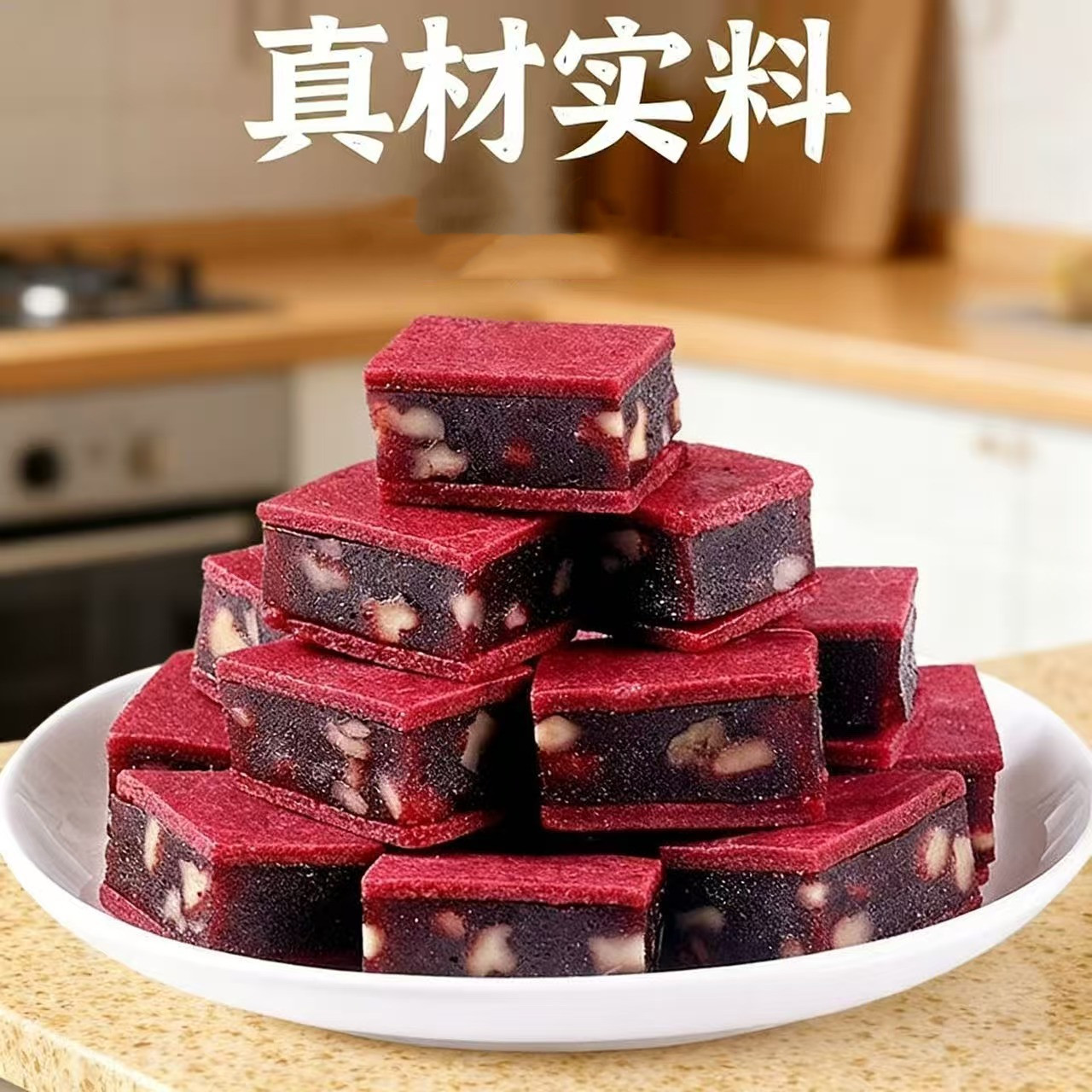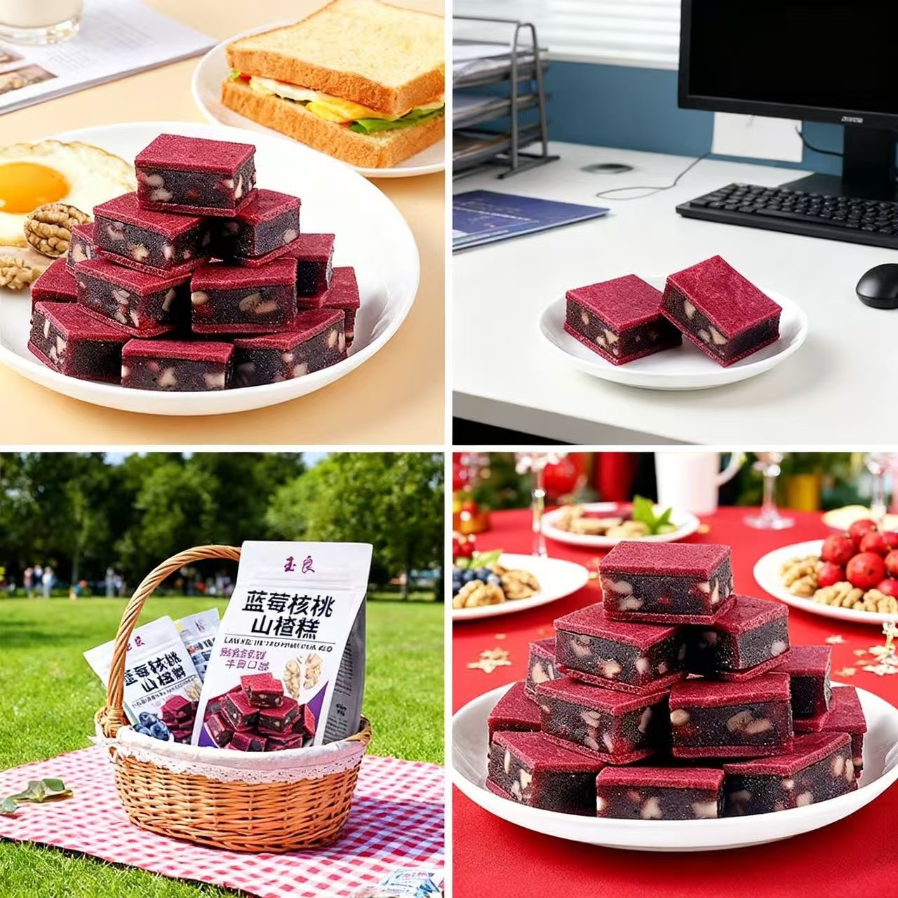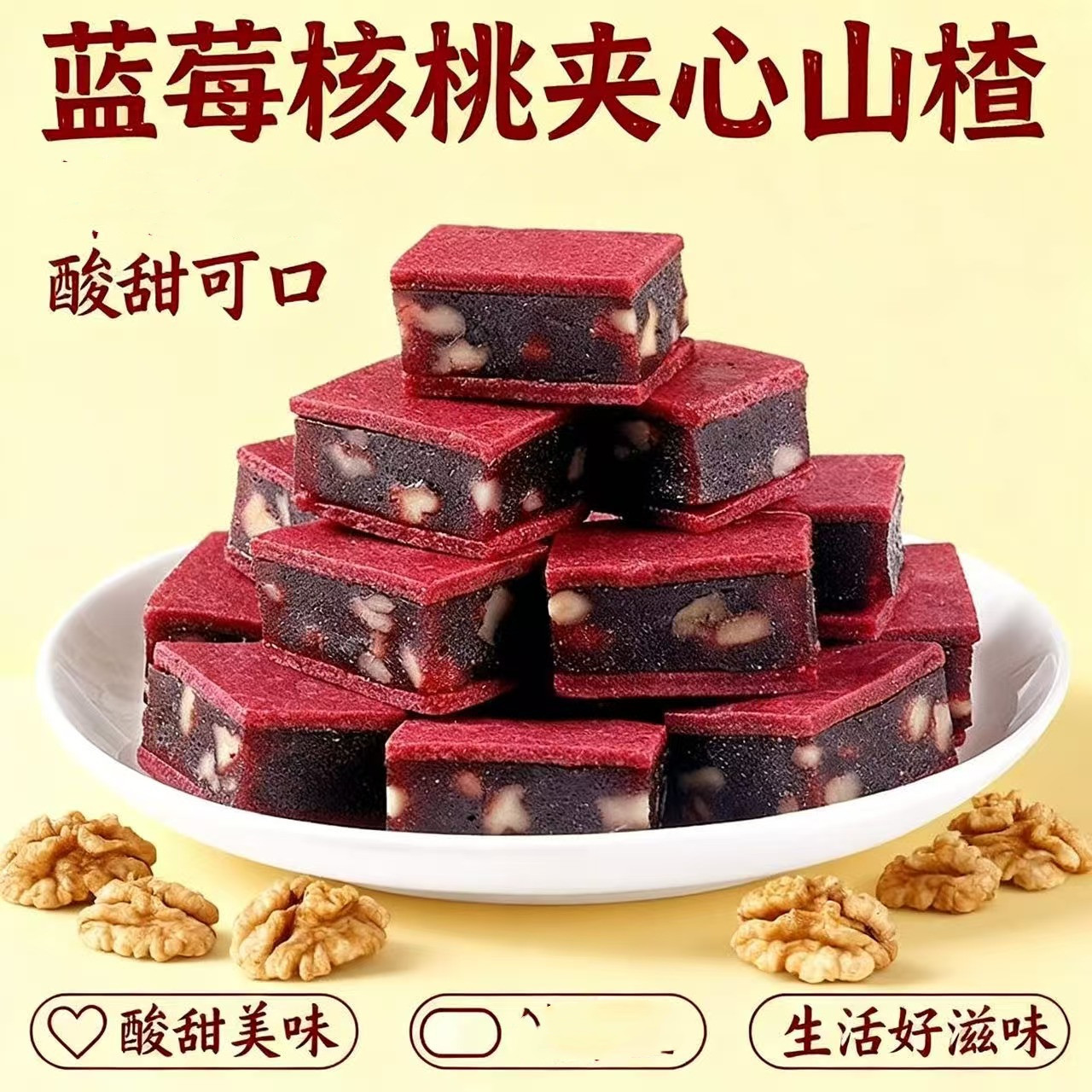配料:蓝莓酱≥25%、山楂片≥25%、核桃仁≥15%、麦芽糖醇、淀粉、桑葚干