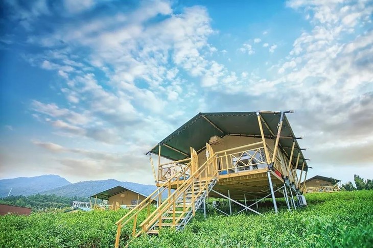 帐篷酒店错落分布在田间,远看是一只只兀自立在茶园间的帐篷,近看竟是一间间隐匿在茶园里的豪华酒店。每顶帐篷都有开阔视野的同时也很好的保护了私密性。