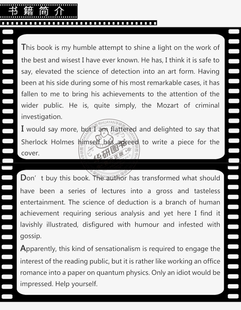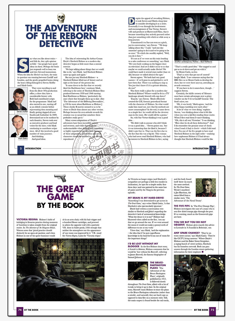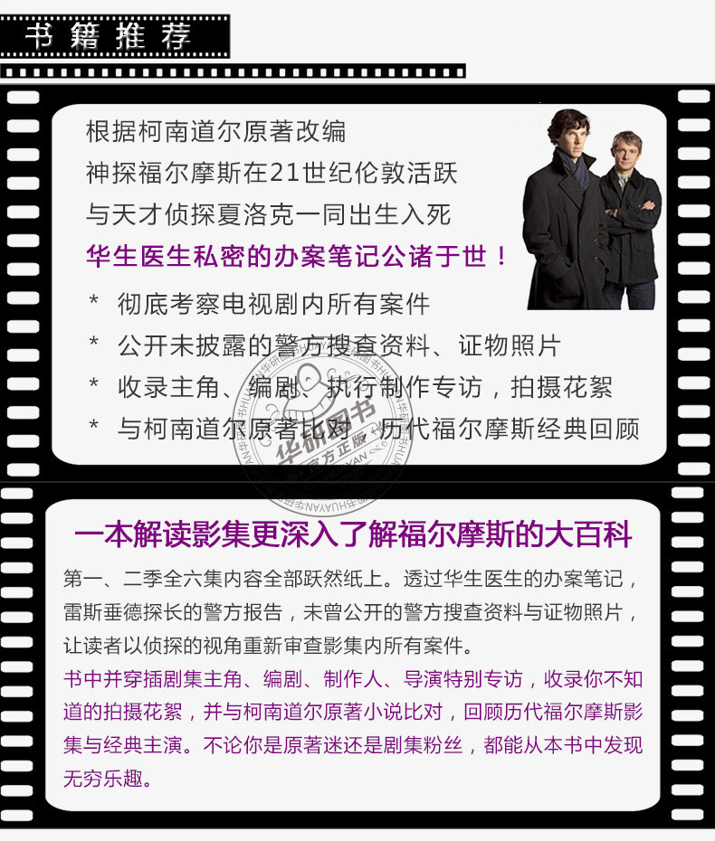 主要讲述了这部剧作的创作过程,以及在拍摄过程的种种。剧组出这本书是为了更加立体地塑造人物,而不仅仅是为了满足粉丝一探剧中内幕的愿望。他们要做的是继续讲述这个故事,讲述这两个非比寻常的人,让粉丝们自己从剧组提供的信息中去感受这个奇迹。 这本Casebook并不仅仅是一本“《神探夏洛克》大揭秘”,而是以华生医生的办案记录的形式重点更对剧集内容进行延伸,并加以对主创、故事背景、原著相关信息的内容介绍等。 本书质量非常好,从内容上讲,有大量的剧照、图片,文字上既讲述了这部剧的由来及制作过程,还深入分析了前两季内容,极大地满足了粉丝的好奇心。每一个小细节都有提及,甚至一些粉丝没有注意到的细节也提出来了,绝对是很好的收藏品。 书中有两人以小纸条的形式进行的有趣又暧昧的对话,还有各种在剧中没有表现的媒体报道等等。就好像华生真的编写了这本书一样,真实感很强!从制作上来讲,这是一本铜版纸印刷的精装四色图文书,十分值得粉丝收藏。
