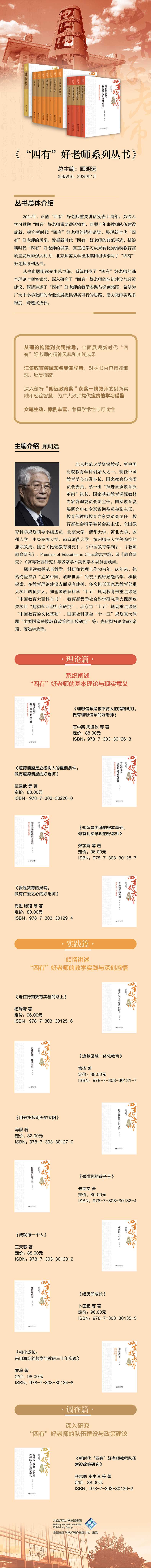 2024年,正值 ;四有好老师重要讲话发表十周年。为深入学习贯彻;四有好老师重要讲话精神,回顾十年来教师队伍建设成就,探究新时代;四有好老师的精神逻辑,展现新时代;四有好老师的风采,发掘新时代;四有好老师的典范事迹,描绘新时代;四有好老师的群像,真正把学习成果转化为推动教育高质量发展的强大动力,北京师范大学出版集团组织编写了;四有好老师系列丛书。丛书由顾明远先生总主编,系统阐述了;四有好老师的基本理论与现实意义,深入研究了;四有好老师的队伍建设与政策建议,倾情讲述了;四有好老师的教学实践与深刻感悟,希望为广大中小学教师的专业发展提供切实可行的思路,助力教师实现多维度、跨越式成长。