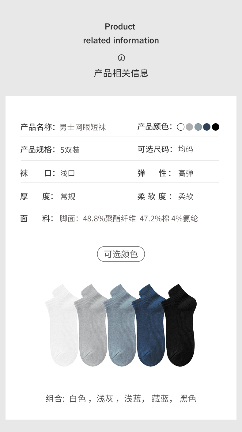 雅黛丽袜子男网眼透气防臭防滑不掉跟日常系列5双装短袜