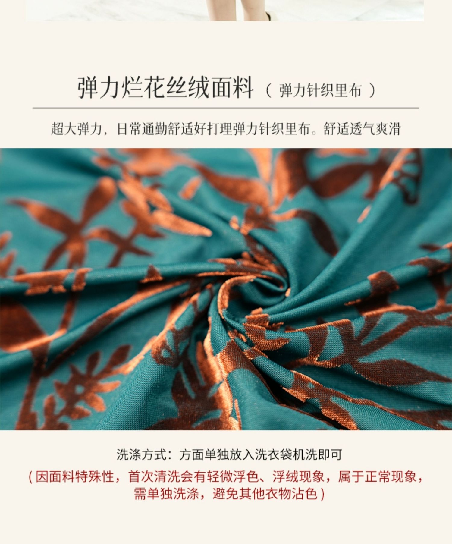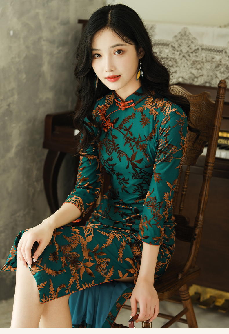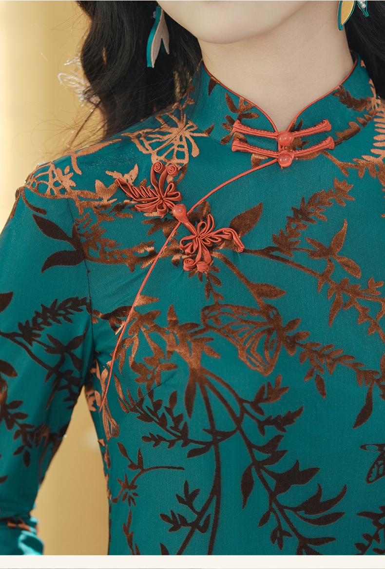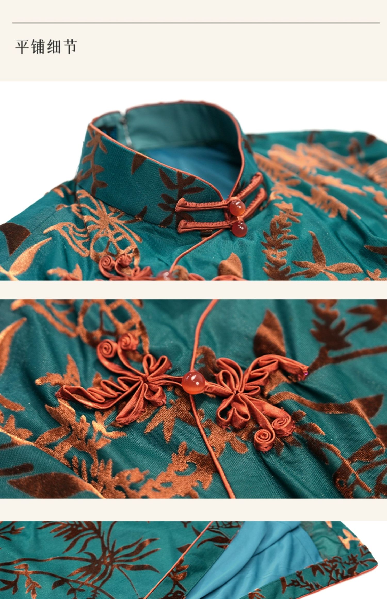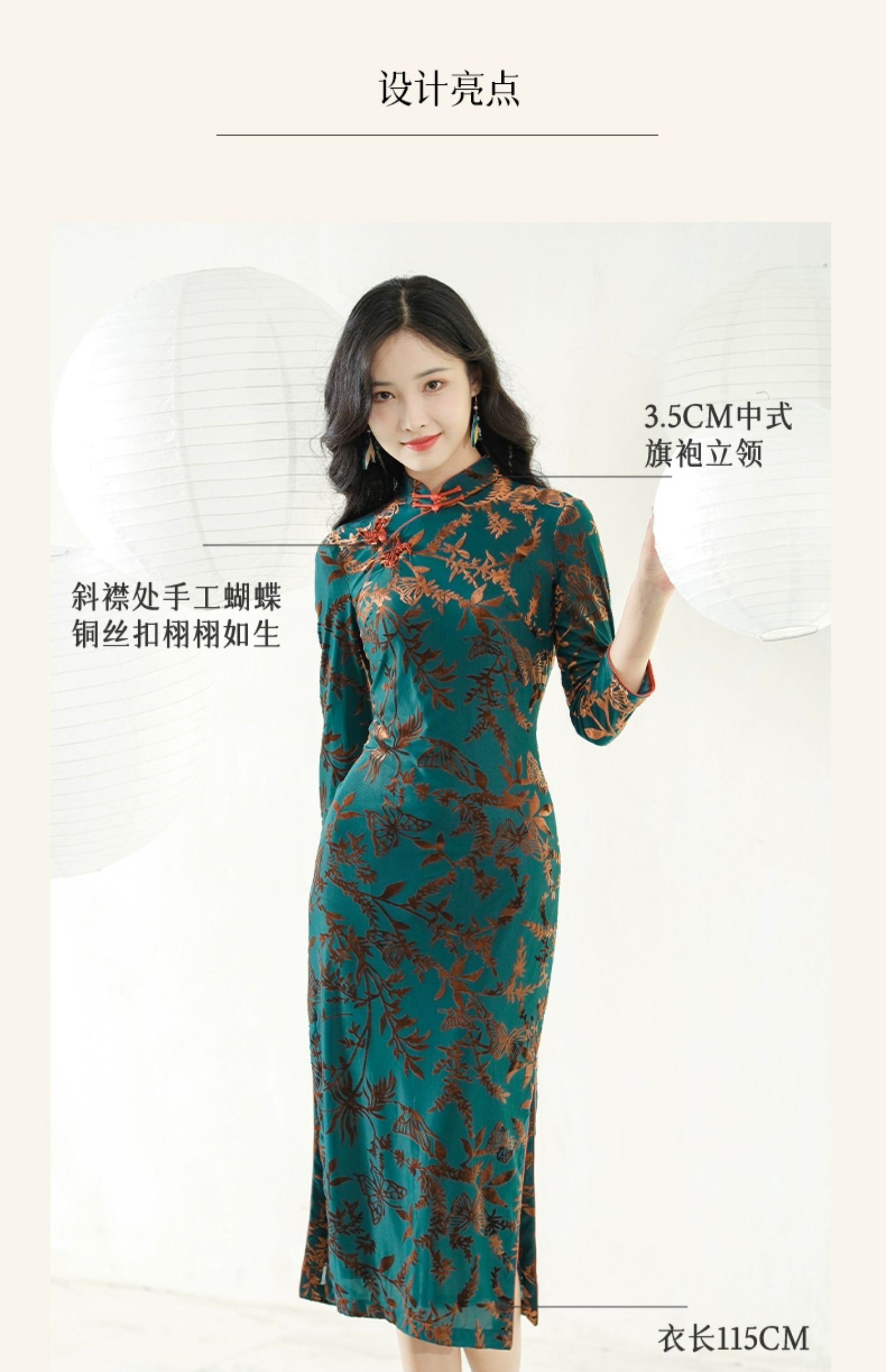 逸红颜蝶语扇2025年秋季新款弹力烂花丝绒旗袍改良版连衣裙女日常