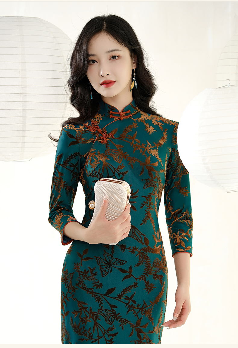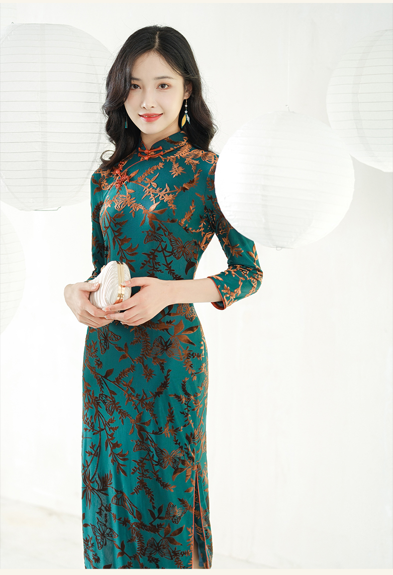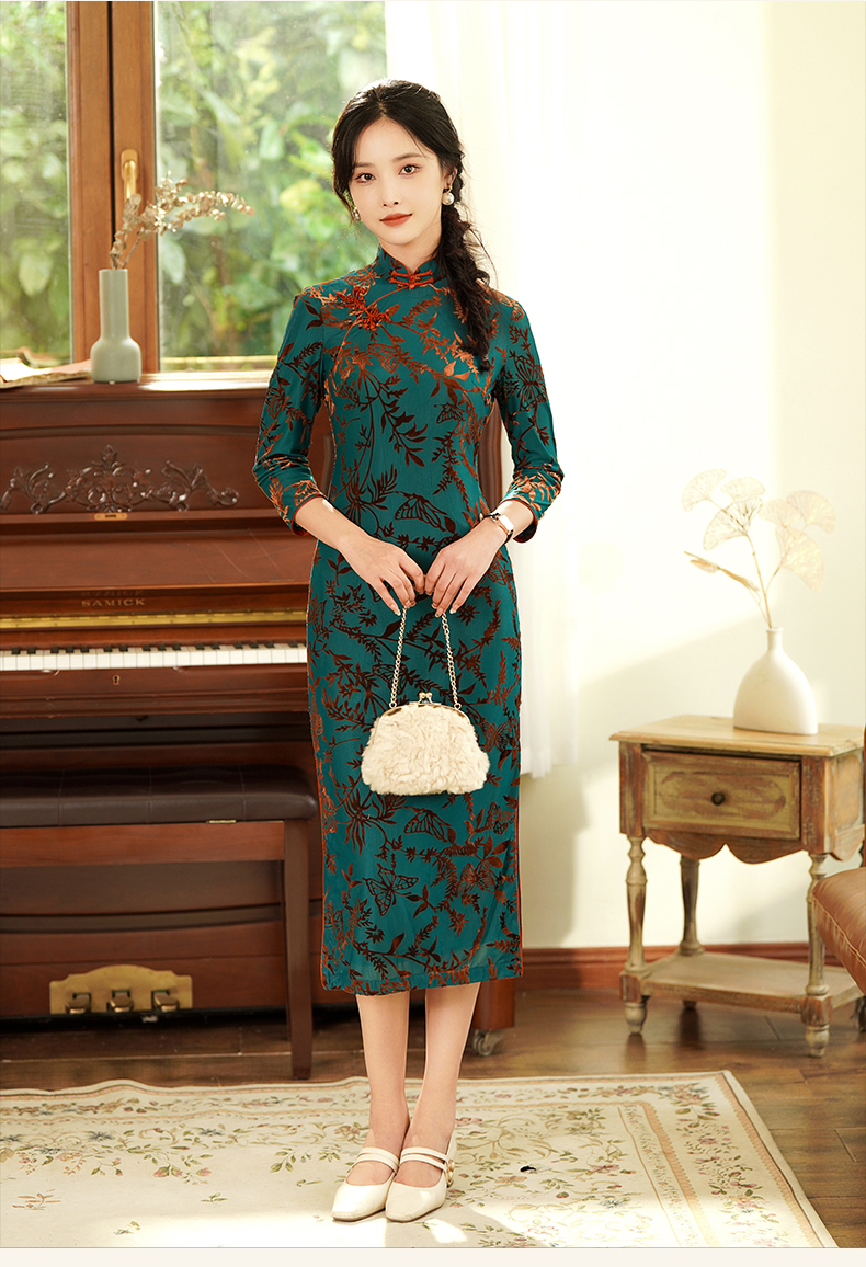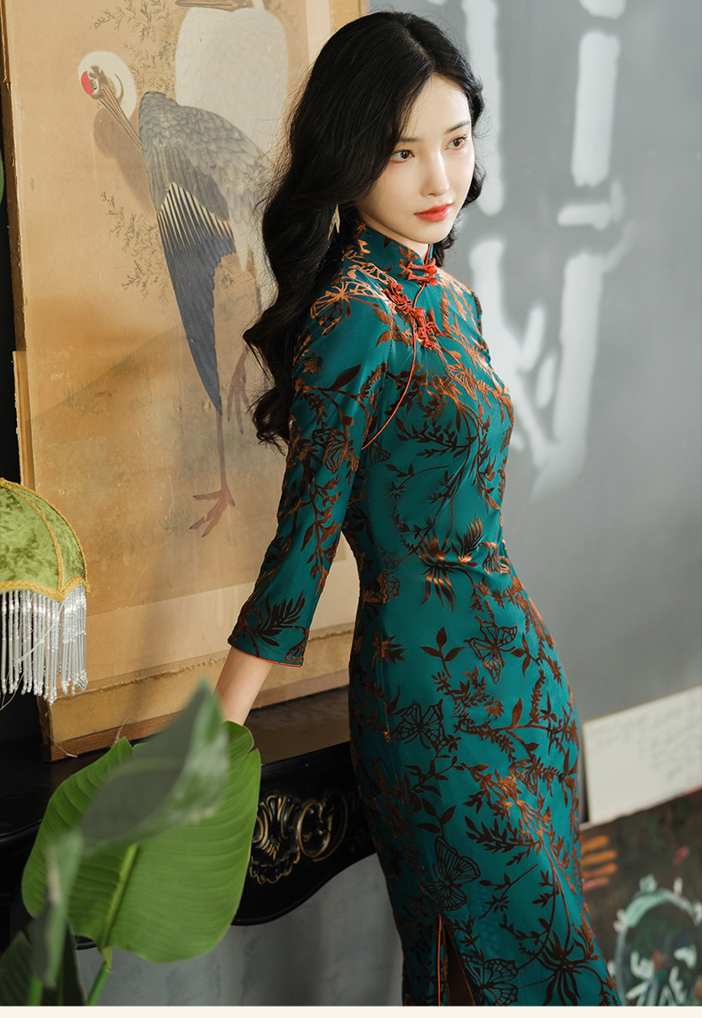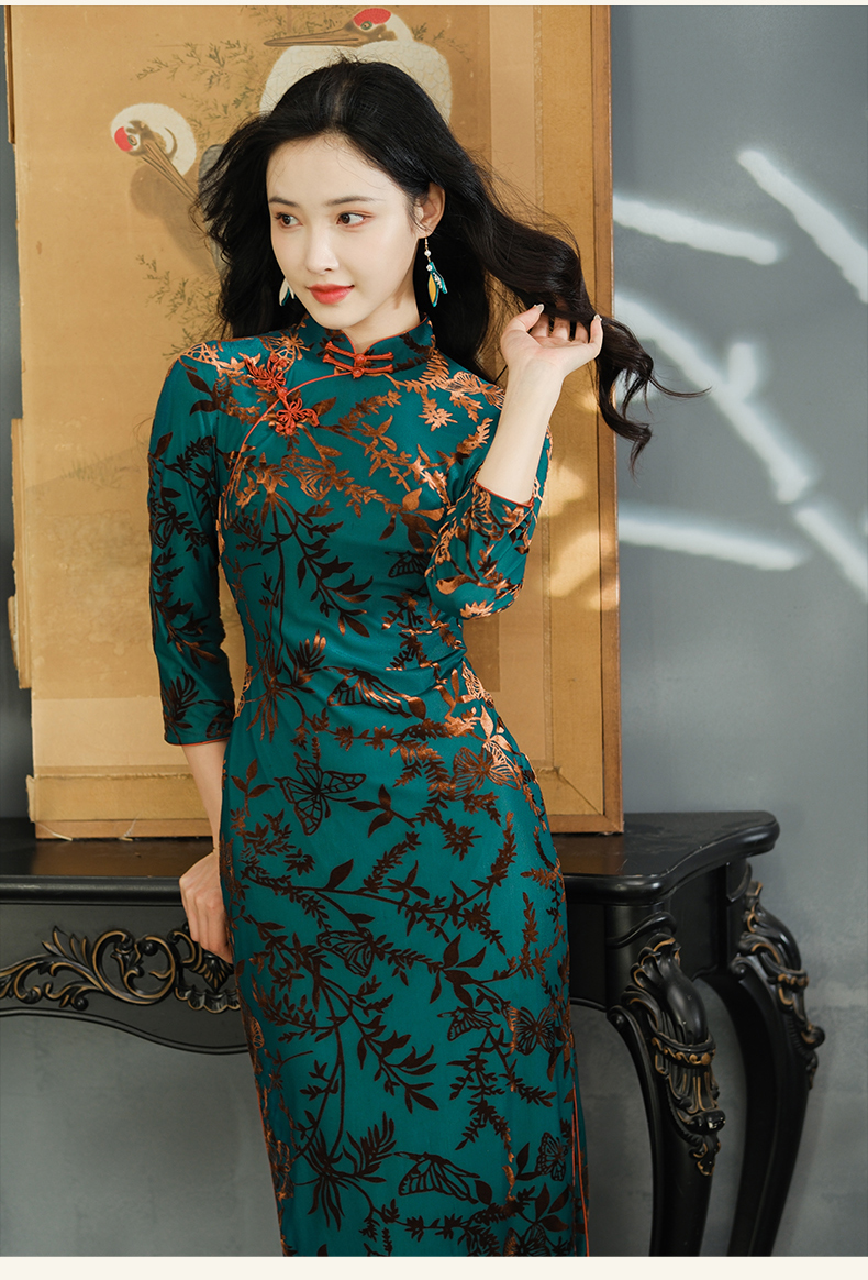 逸红颜蝶语扇2025年秋季新款弹力烂花丝绒旗袍改良版连衣裙女日常