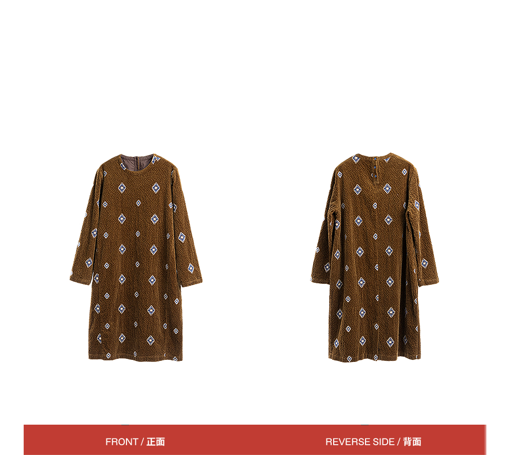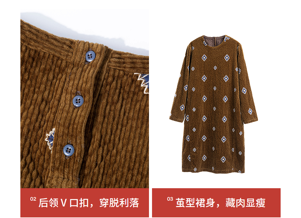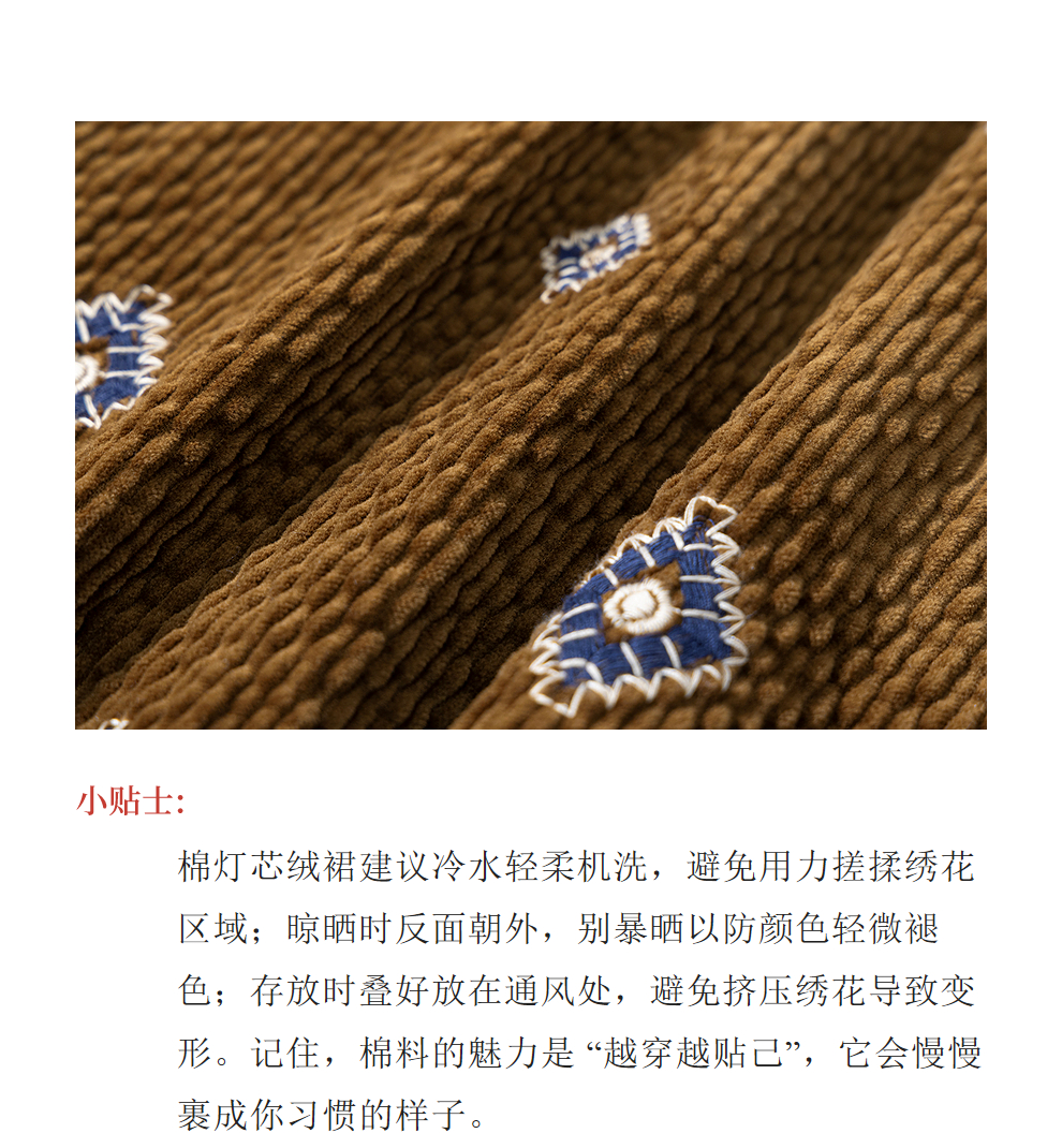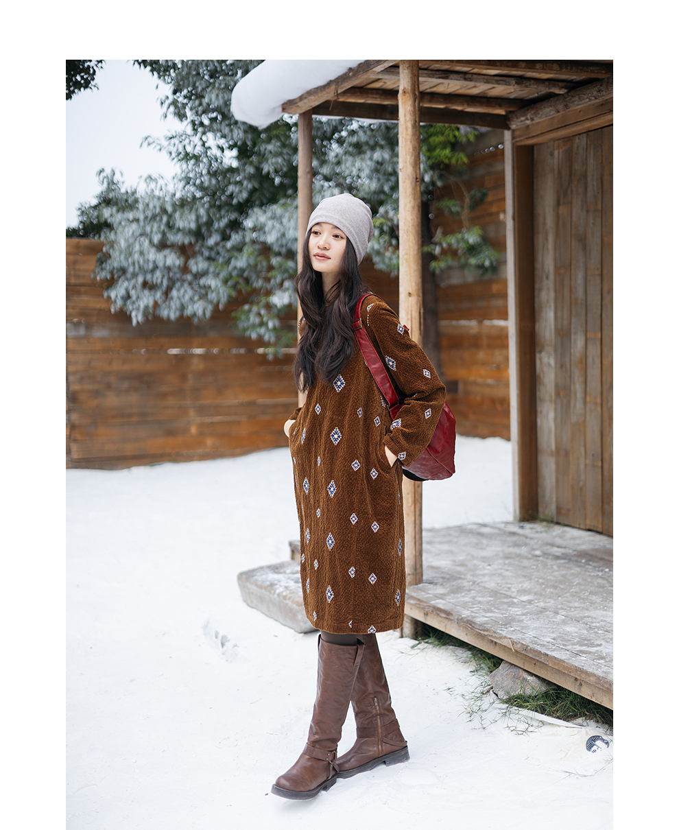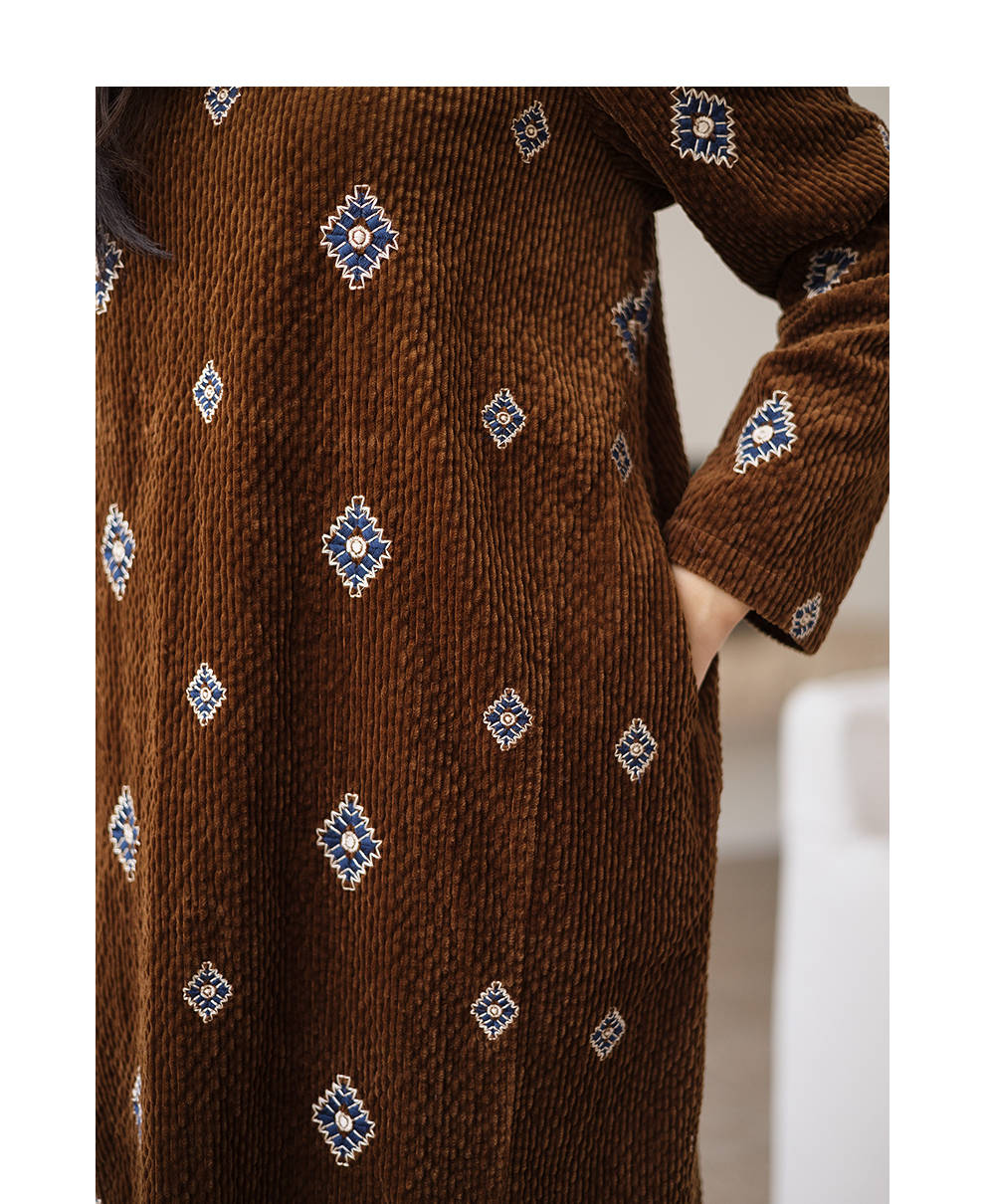 绽放855朵/绣花灯连衣裙·棉灯芯绒几何刺绣藏肉显瘦裙子女中长款
