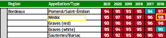 尼尔·马丁(Neal Martin)将波尔多此年份评为“毋庸置疑的大年”。《葡萄酒爱好者》(Wine Enthusiast)则给予了梅多克整体 98 分的高度评价。