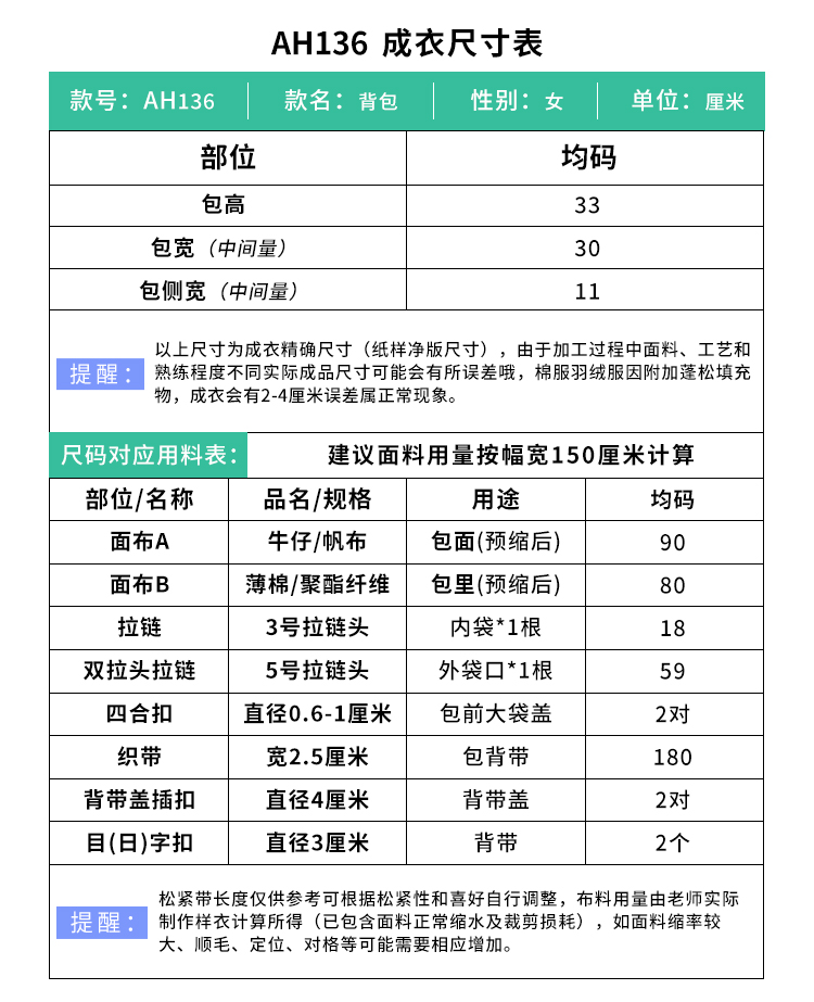 裁缝学苑AH136百搭牛仔布双肩包纸样女装复古书包大容量背包样板图纸