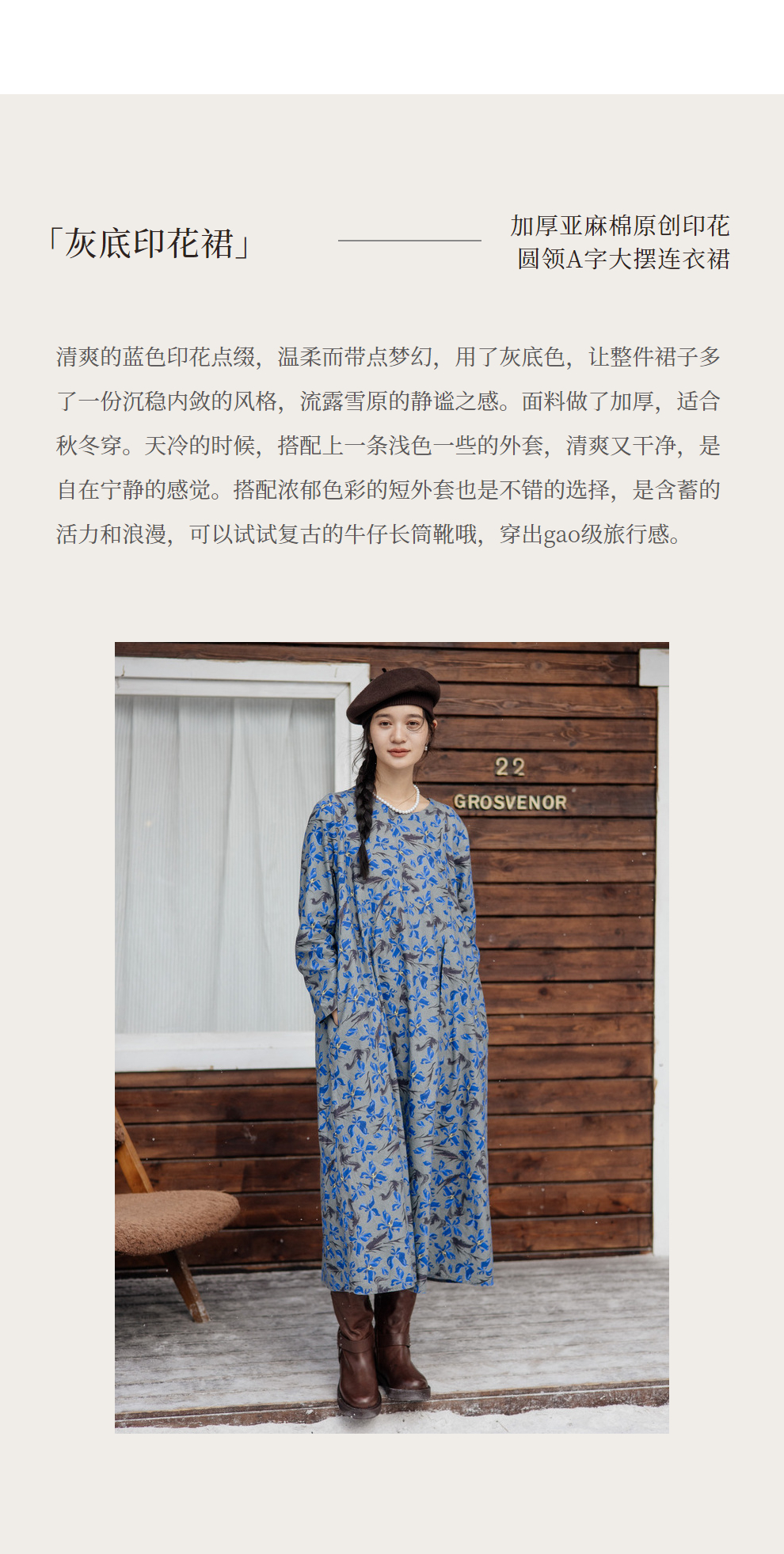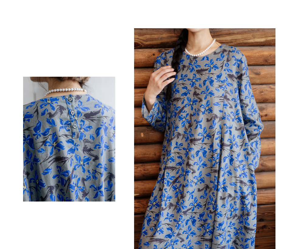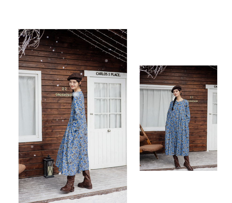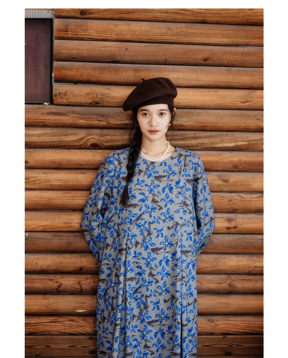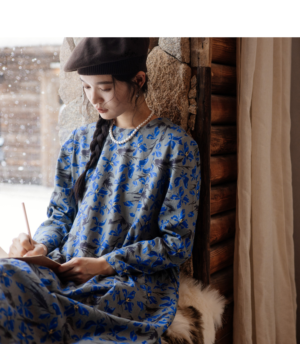 绽放旅行女装852朵/冬季加厚亚麻棉原创印花圆领A字大摆连衣裙
