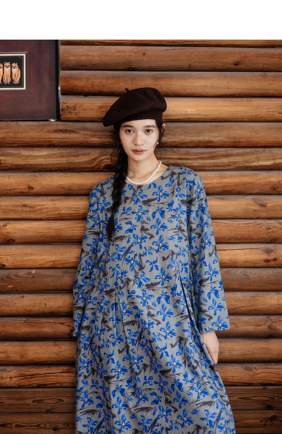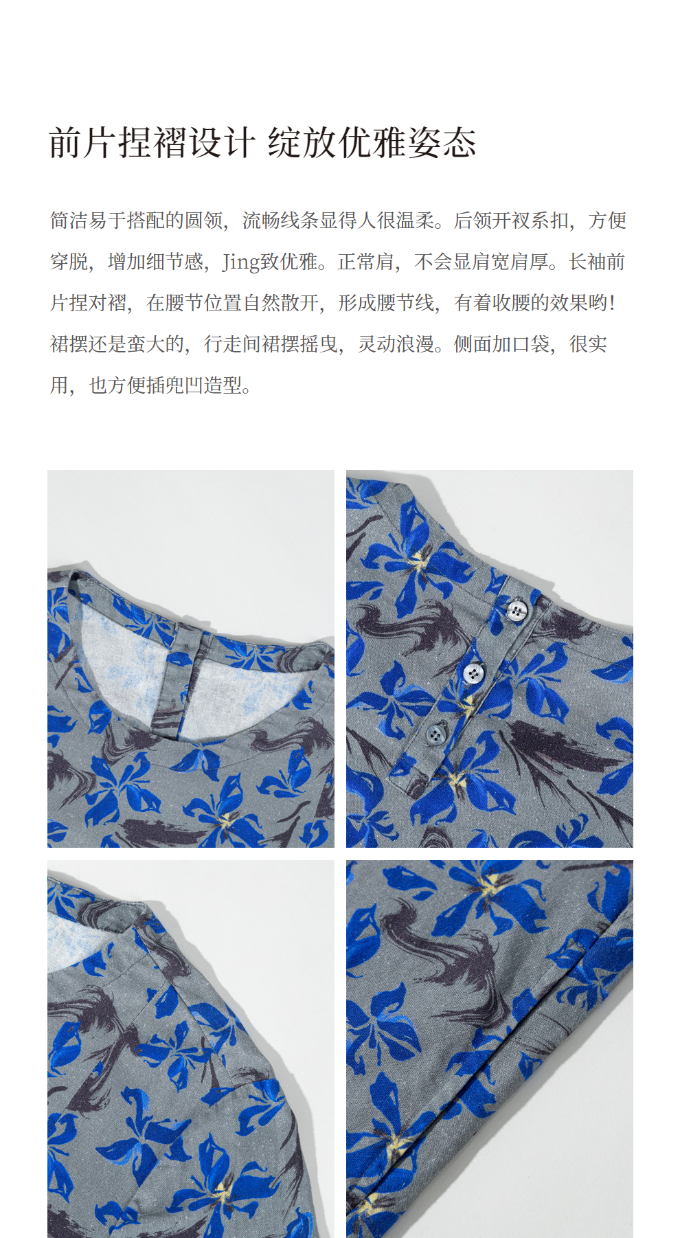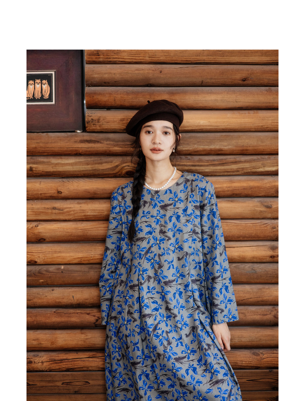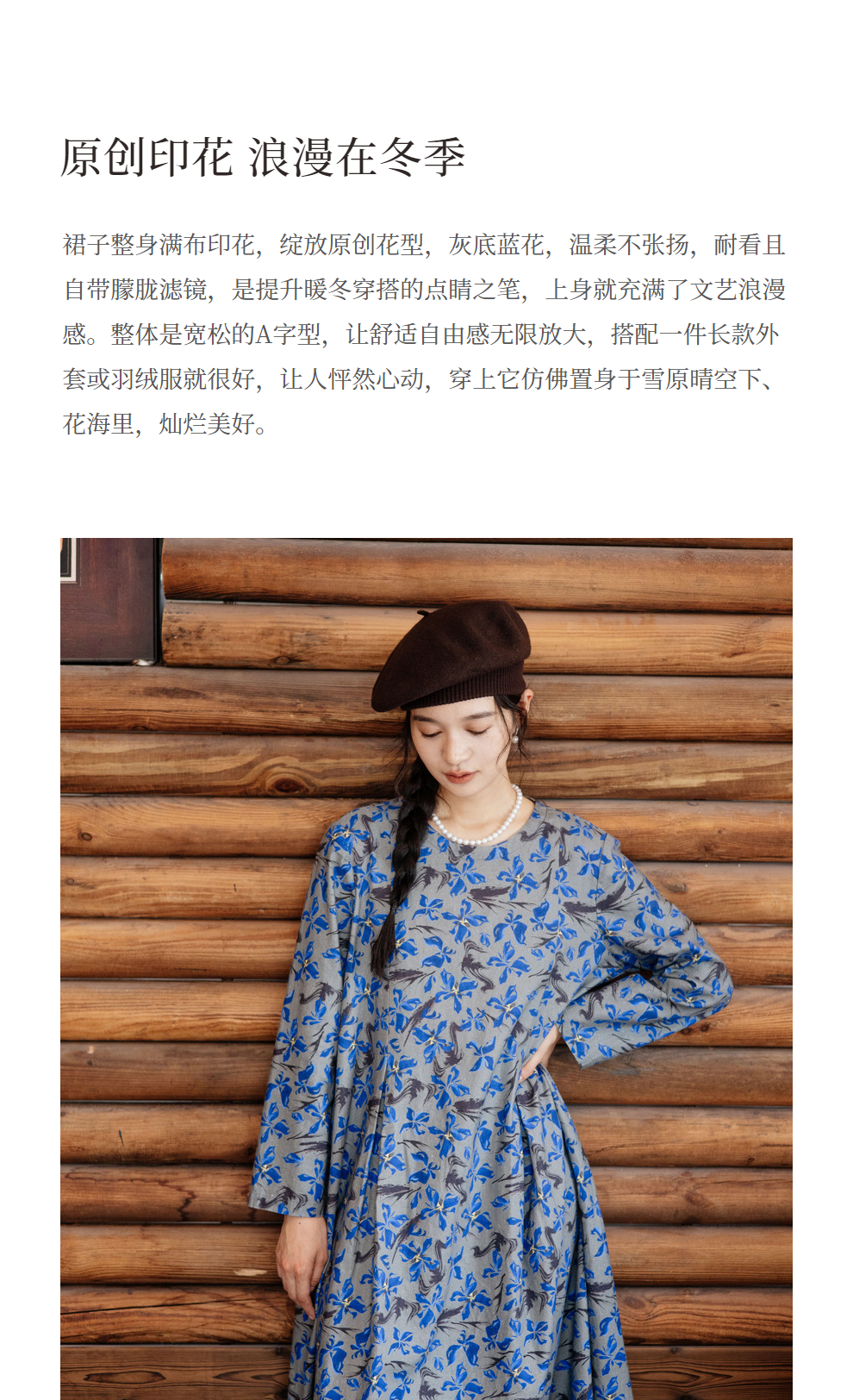 绽放旅行女装852朵/冬季加厚亚麻棉原创印花圆领A字大摆连衣裙