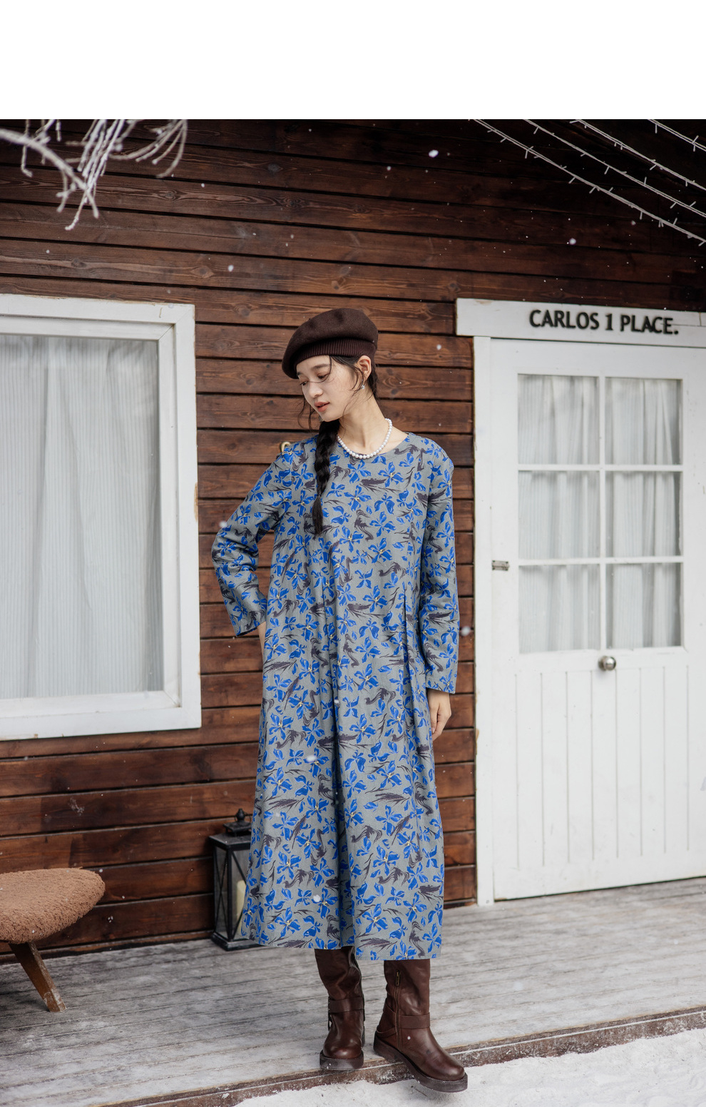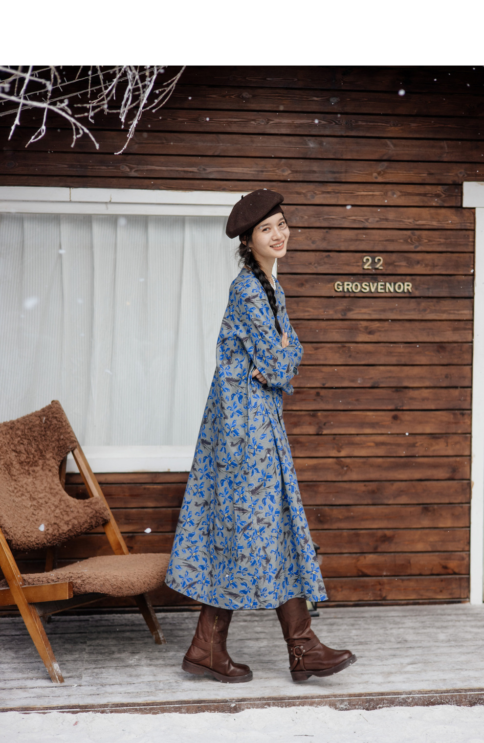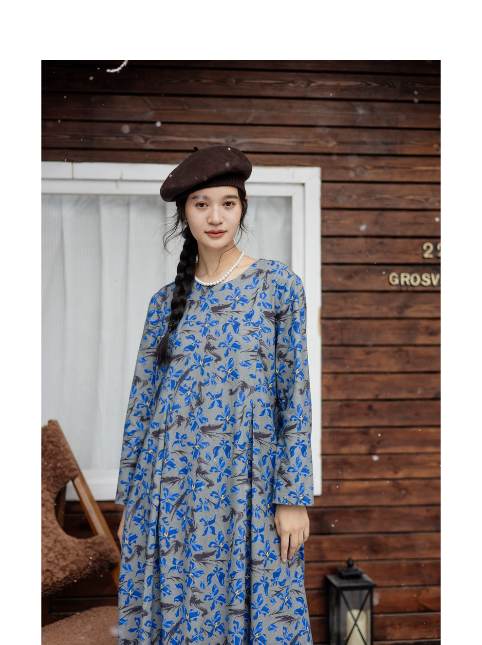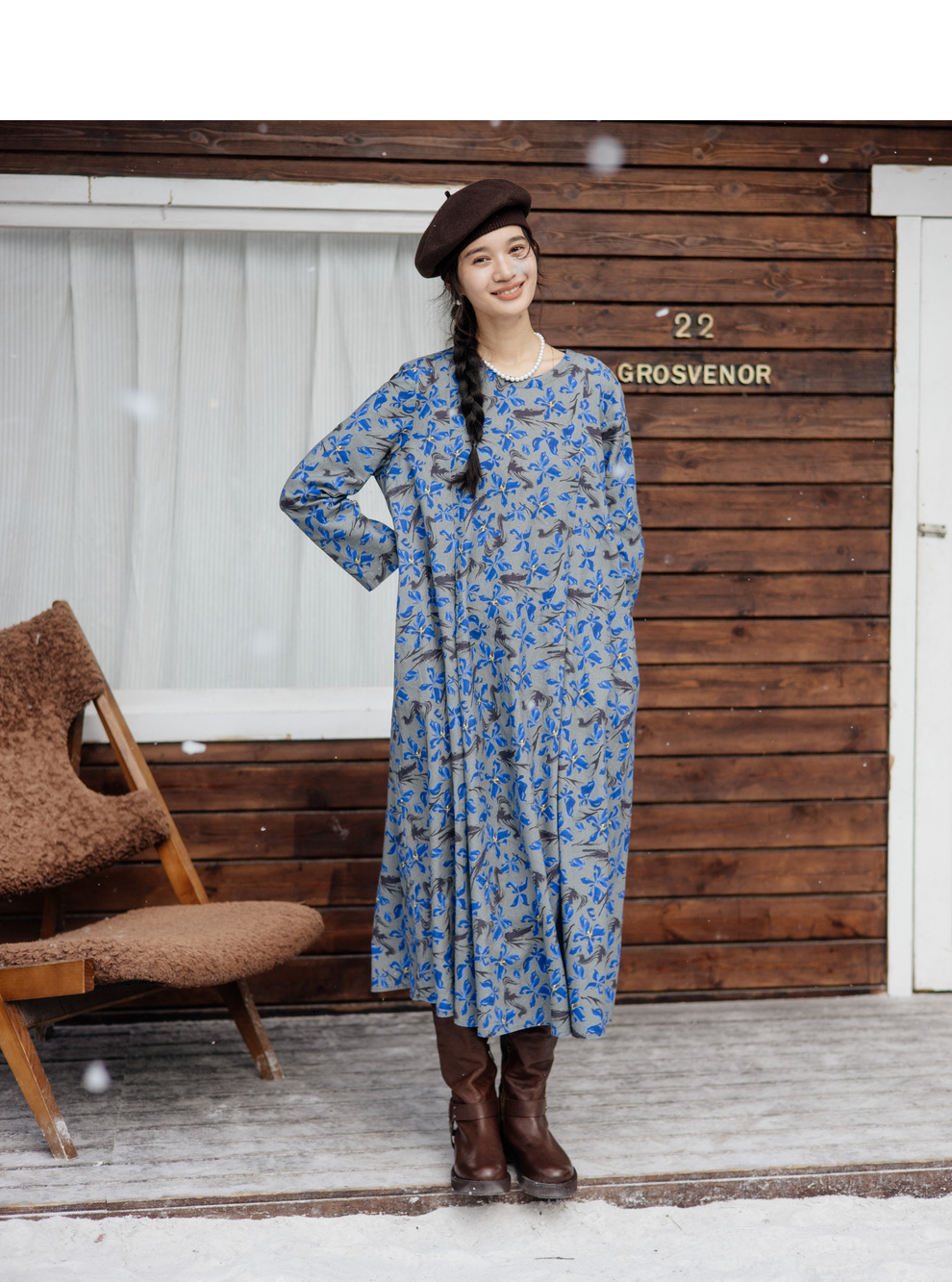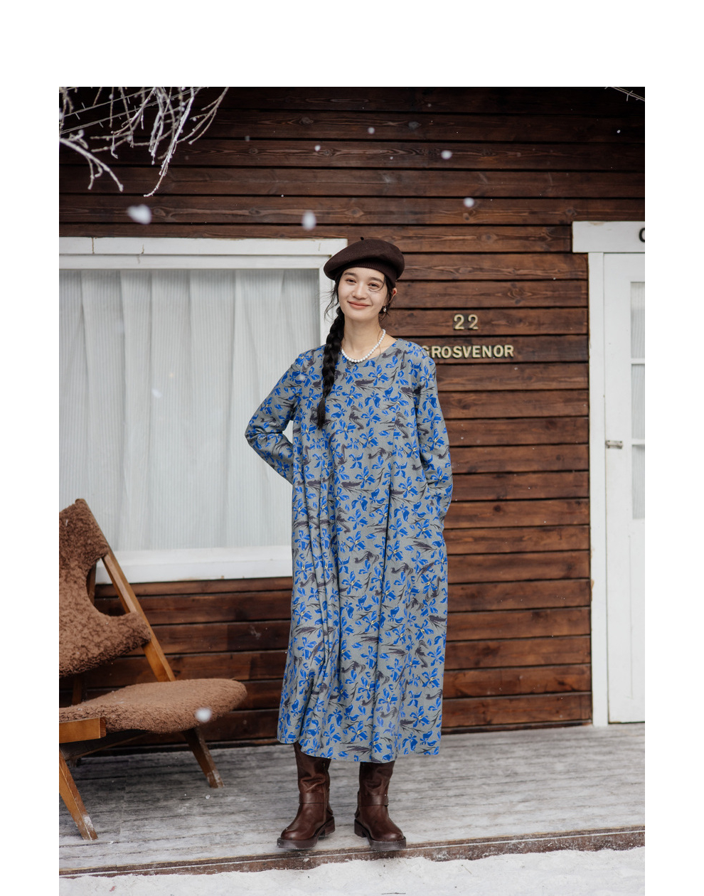 绽放旅行女装852朵/冬季加厚亚麻棉原创印花圆领A字大摆连衣裙