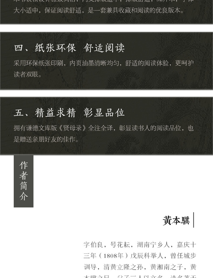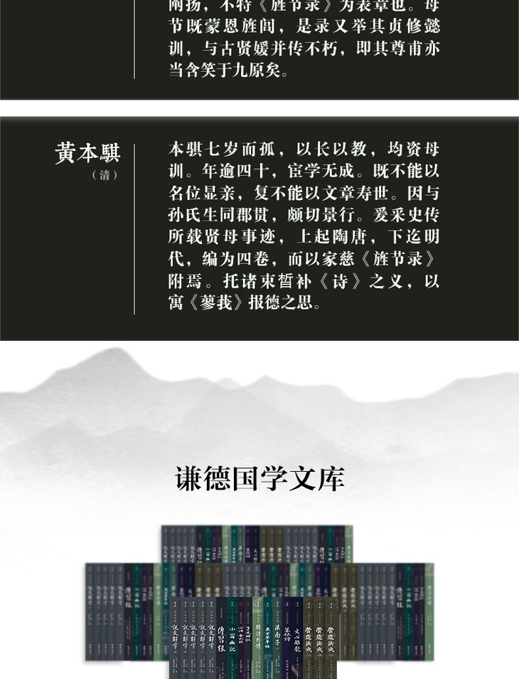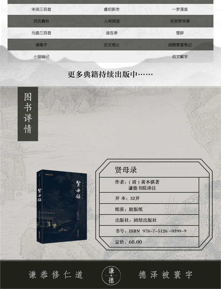 清代黄本骐以宋代孙颀《贤母录》为蓝本,辑录史传所载贤母事迹,上起陶唐,下迄明代,编为四卷,而以黄母刘氏《旌节录》附录于后,可谓东方母教全书,首次点校注译出版。