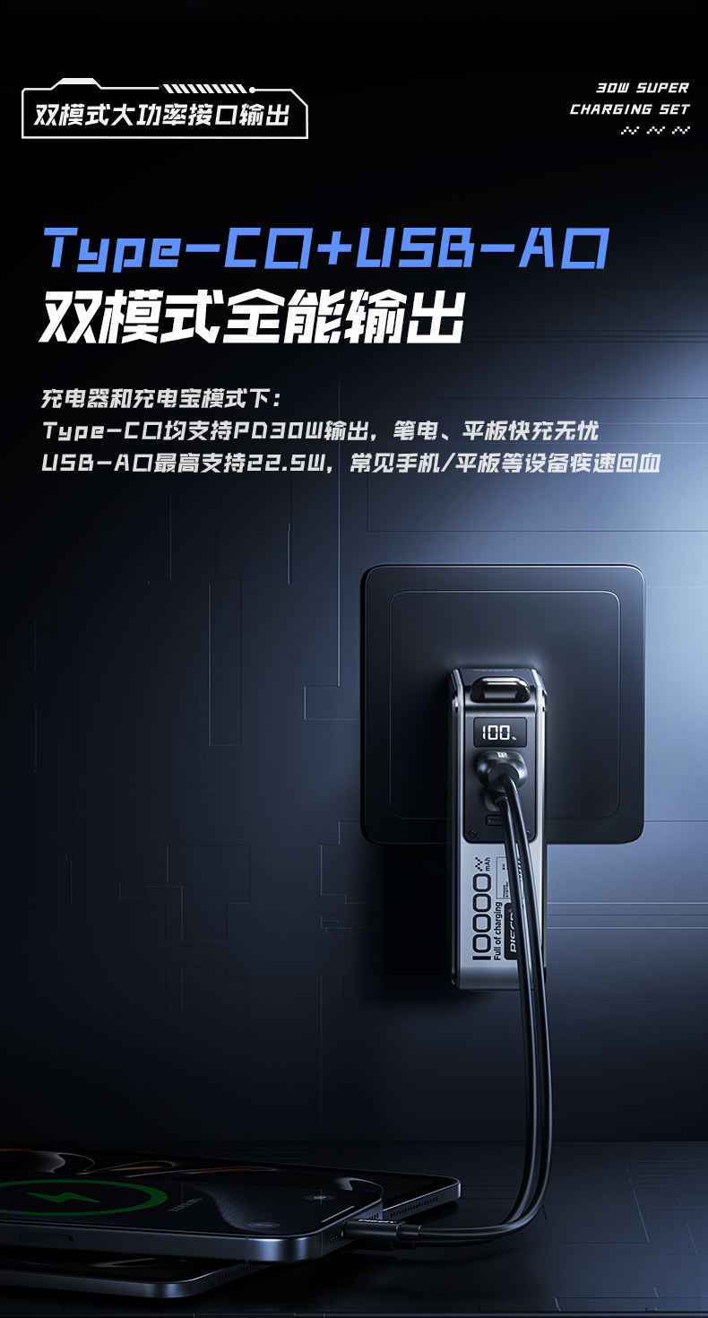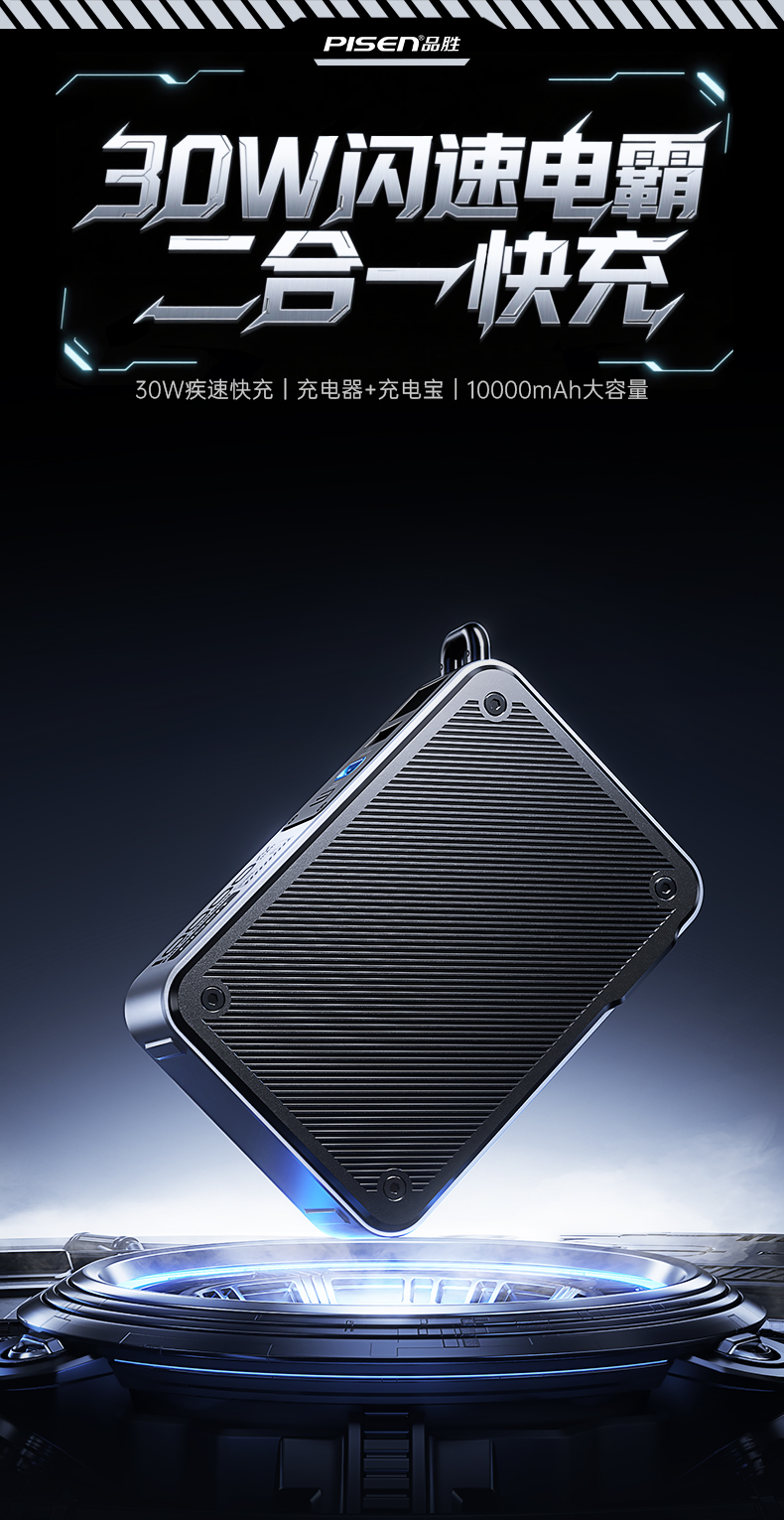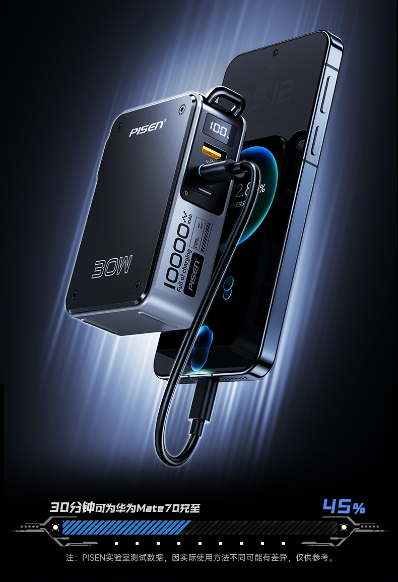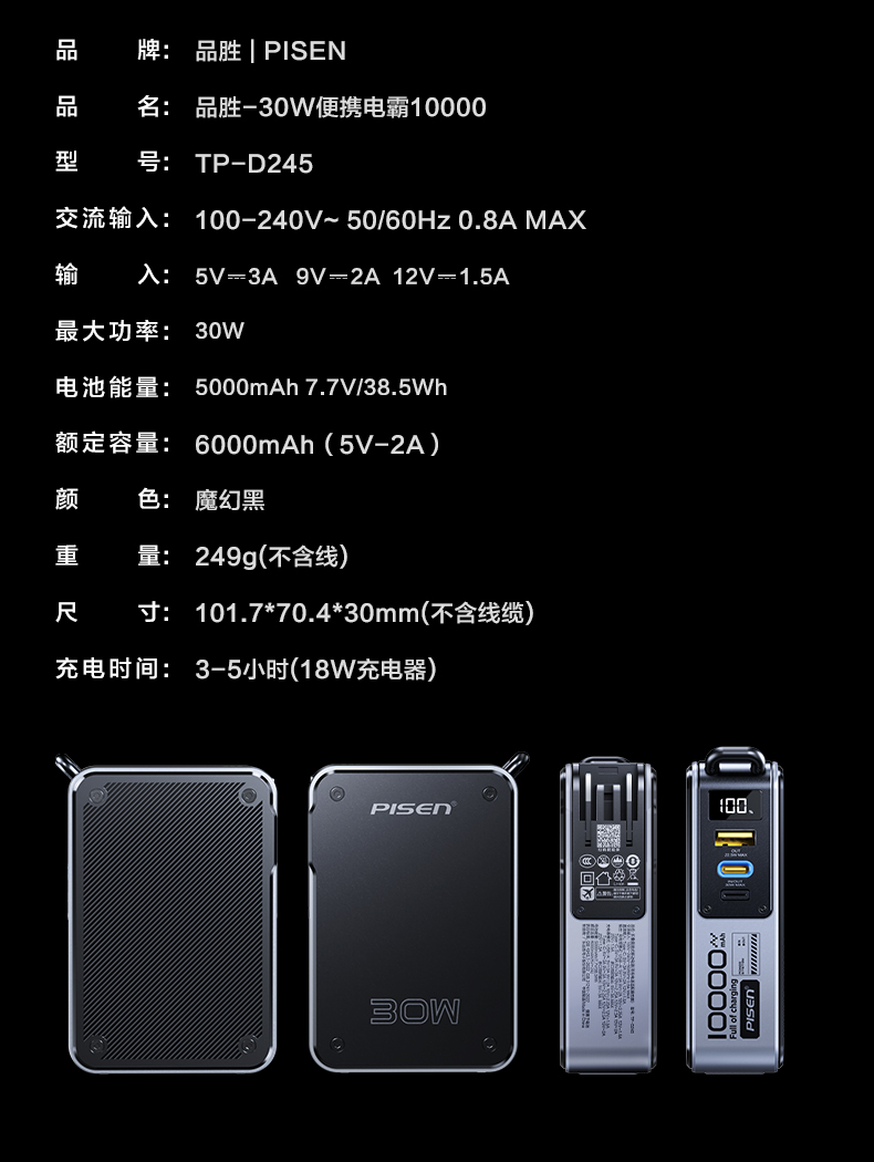 品胜 30W便携挂绳电霸10000毫安充电宝 支持苹果/华为/荣耀/小米等设备快充移动电源