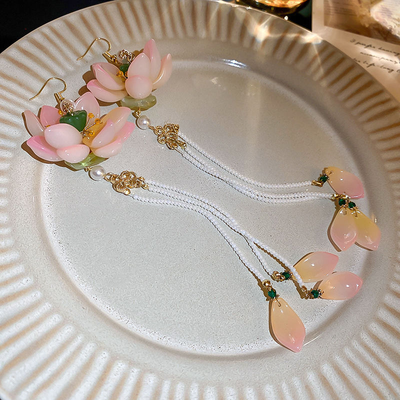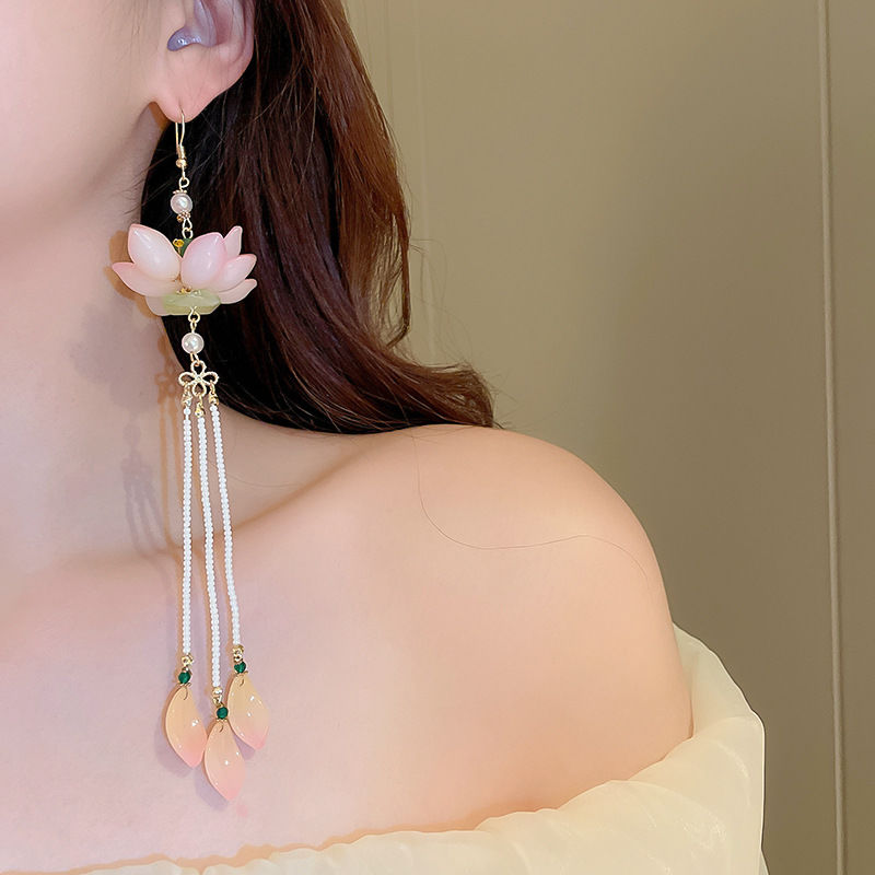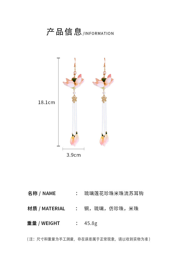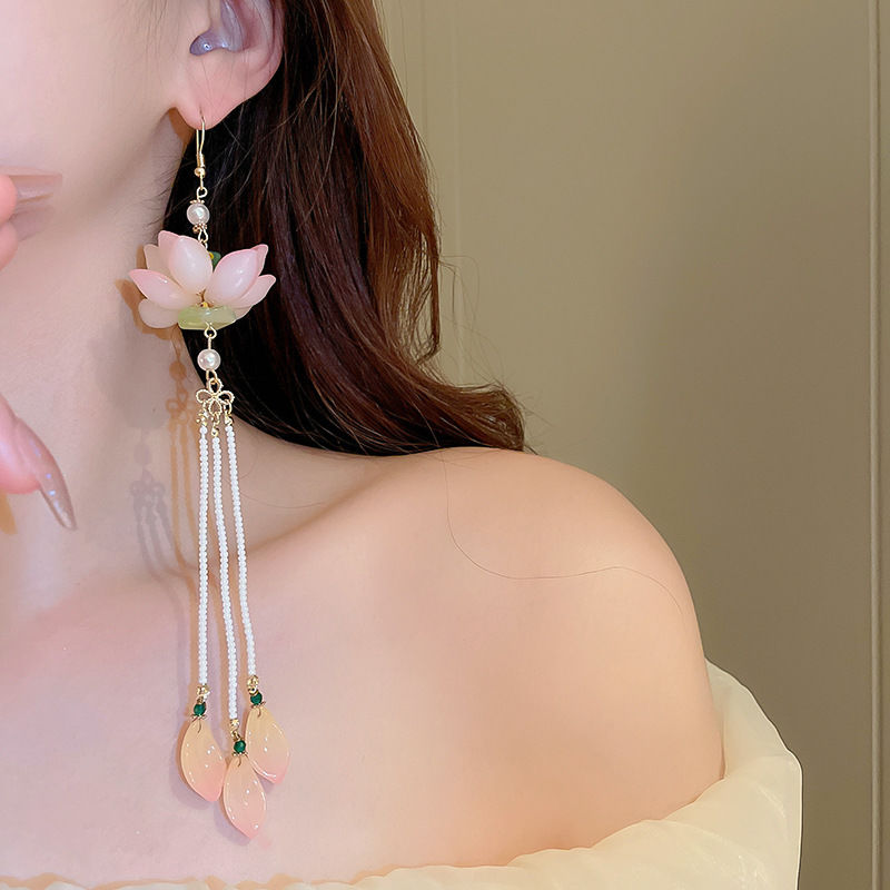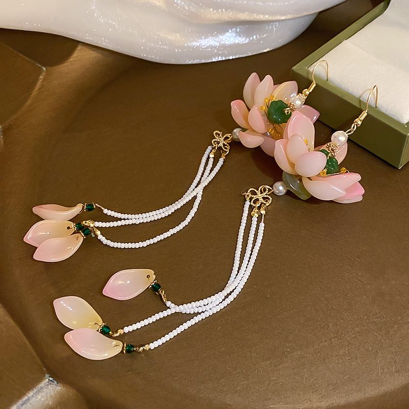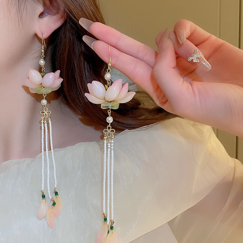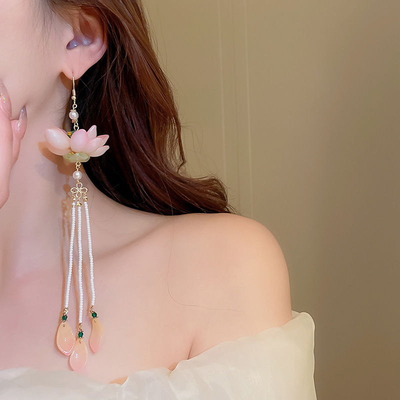 莲花珍珠米珠流苏耳环女款森系时尚小众耳钩个性百搭感耳饰女