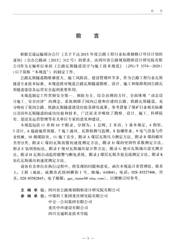 《公路瓦斯隧道设计与施工技术规范》(JTG/T 3374—2020)的管理权和解释权归交通运输部,日常管理和解释工作由主编单位四川省公路规划勘察设计研究院有限公司负责。
