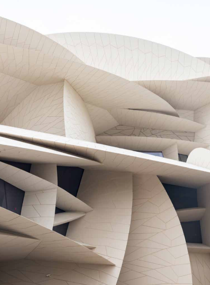由让·努维尔设计的多哈卡塔尔国家博物馆,灵感源于中东干旱的地表矿物晶体“沙漠玫瑰石”的形态,以此寻求场地、景观与社区本质在历史与当代之间的新对话。
