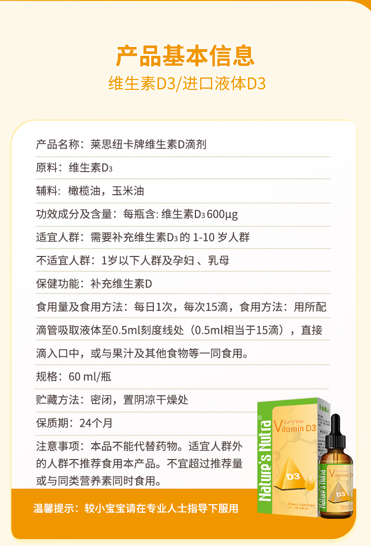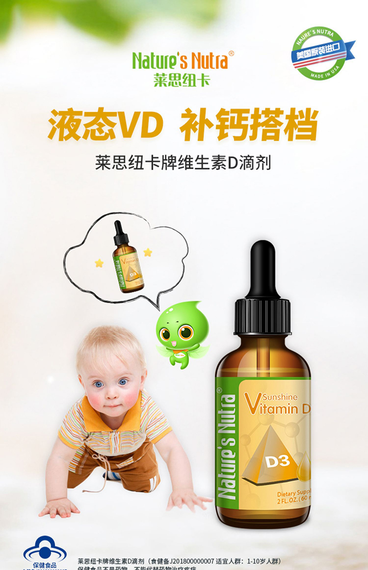 【一般贸易】美国莱思纽卡婴幼儿维生素D3滴剂60ml