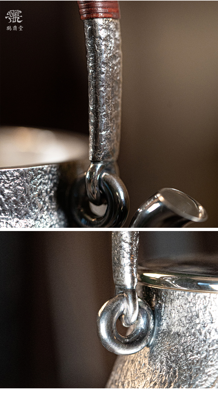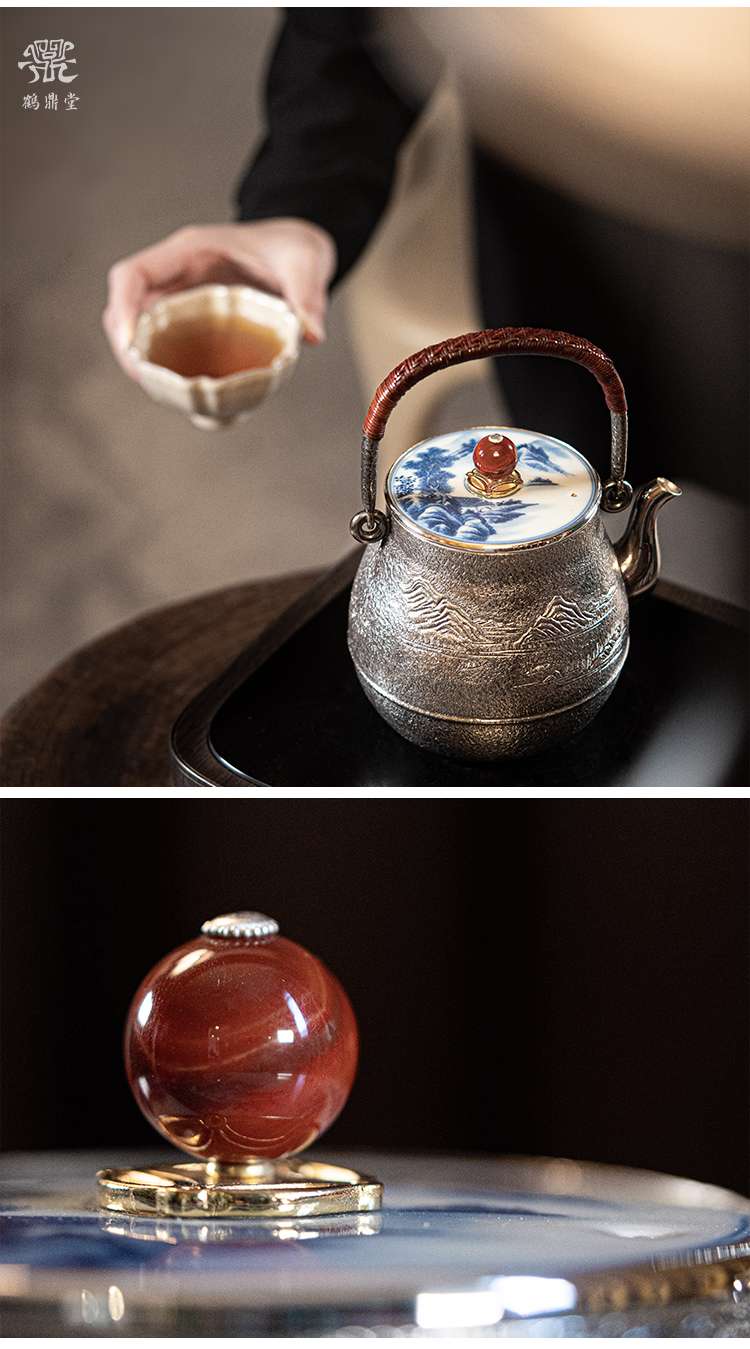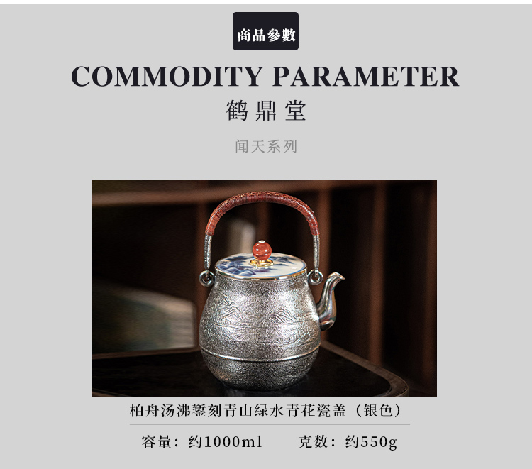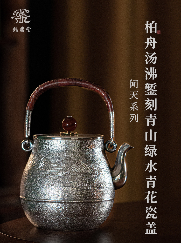 鹤鼎堂银壶闻天系列柏舟汤沸錾刻青山绿水青花瓷盖(银色)(缺货)