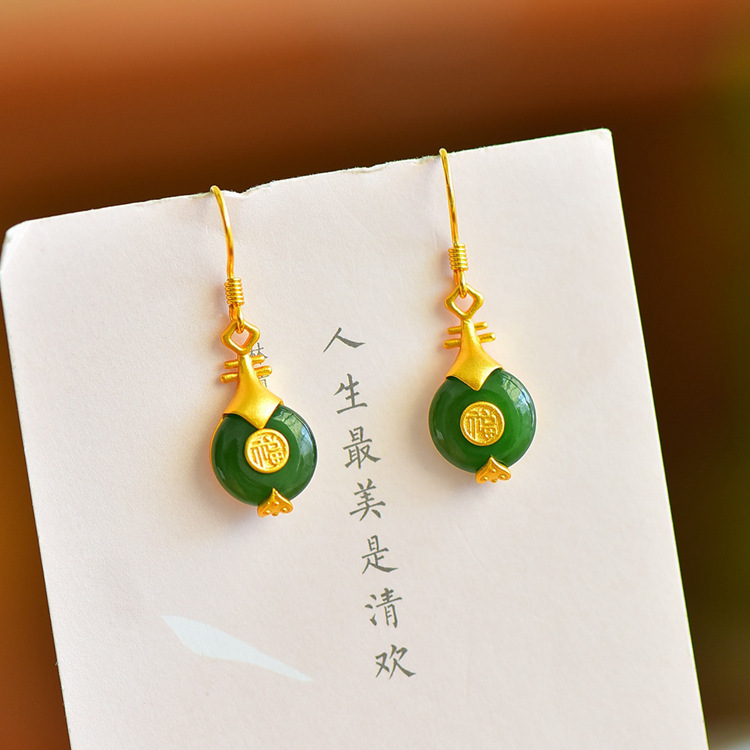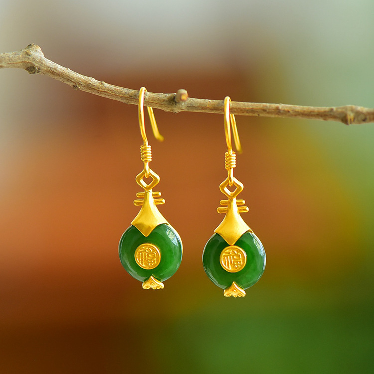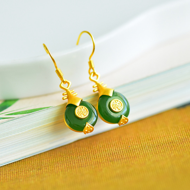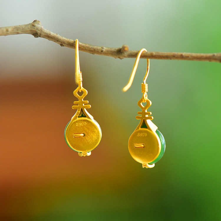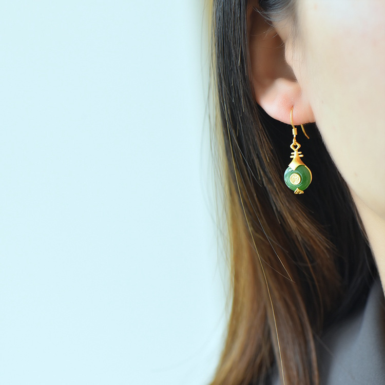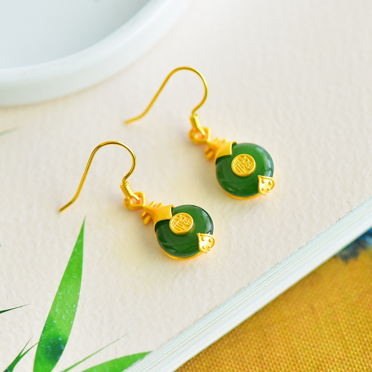 JX12279-6新款中式银镀金福字琵琶镶平安扣和田碧玉耳坠