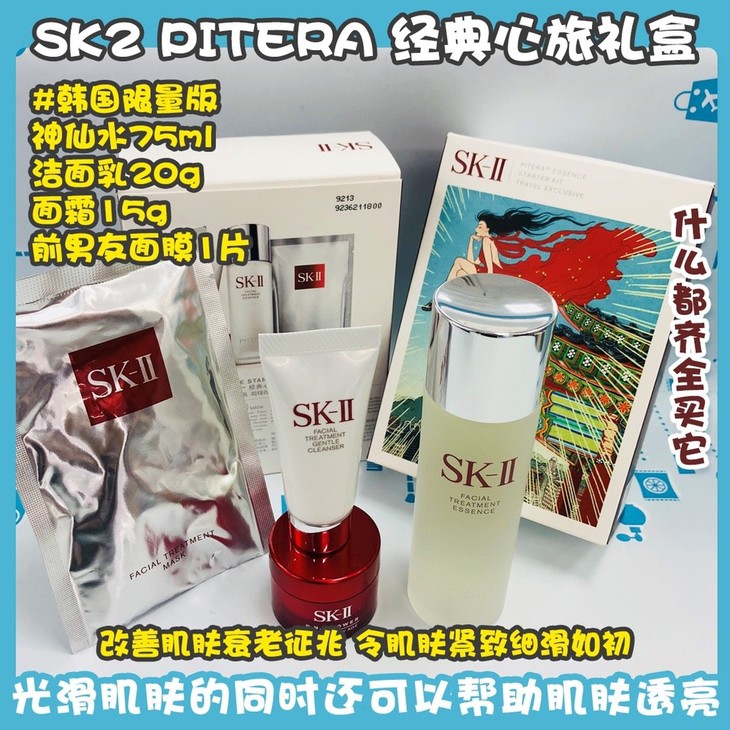 SK2 PITERA™ 经典心旅礼盒#韩国限量版👍SKII套装啊啊啊,卖疯了的一套😱,你想要的洁面、神仙水什么的都有呀呀呀🤗~神仙水💦补充肌肤水分,光滑肌肤帮助肌肤透亮✨,舒缓日晒后的肌肤☀。洁面乳拥有丰富细腻的保湿泡沫☁,深入毛孔清洁,性质温和洗后柔嫩不紧绷😇。面霜具有淡化顽固法令纹、细纹、👊改善肌肤衰老征兆,令肌肤紧致细滑如初⚡~前男友面膜更不用说了❗亮嫩白,连敷就有可见的肌肤保湿修复🙆,提升光泽感的效果!套装包括:神仙水75ml➕洁面乳20g➕面霜15g➕前男友面膜1片。