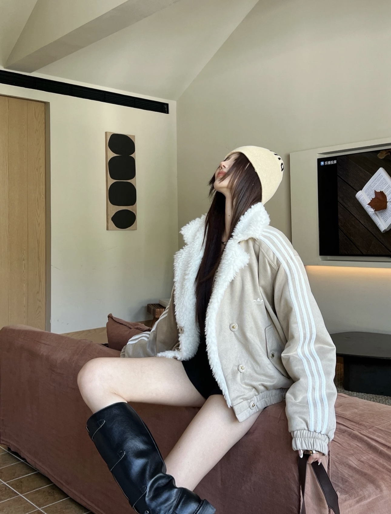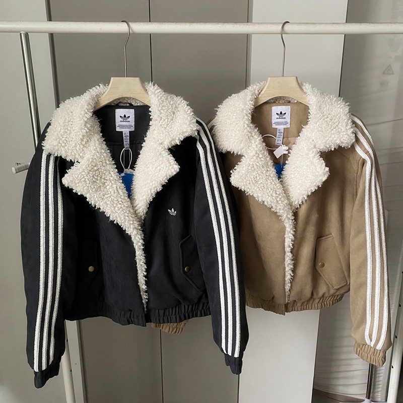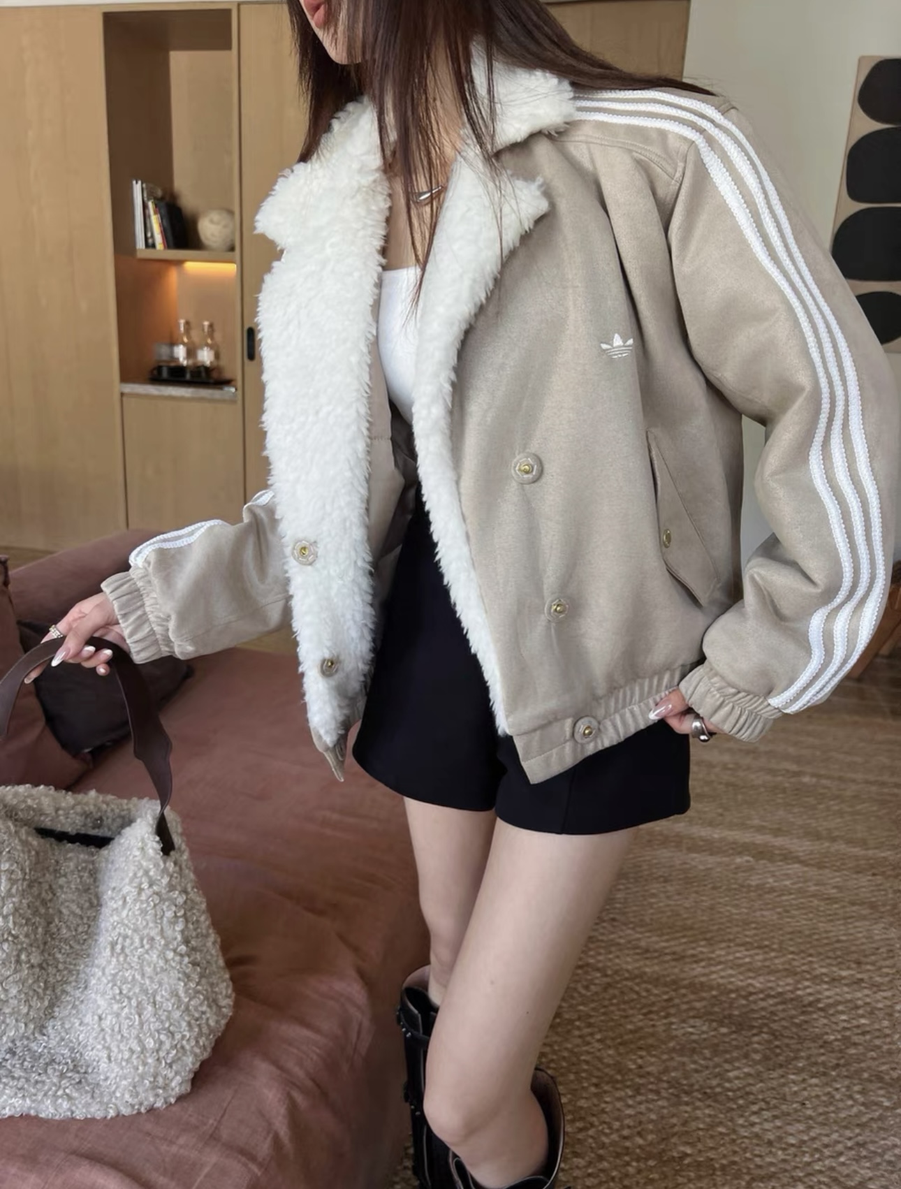 麂皮绒+羊羔绒拼接,毛领翻领设计,