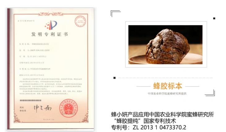 *蜂小妍产品应用中国农业科学院蜜蜂研究所 “蜂胶提纯”国家专利技术 专利号:ZL 2013 1 0473370.2