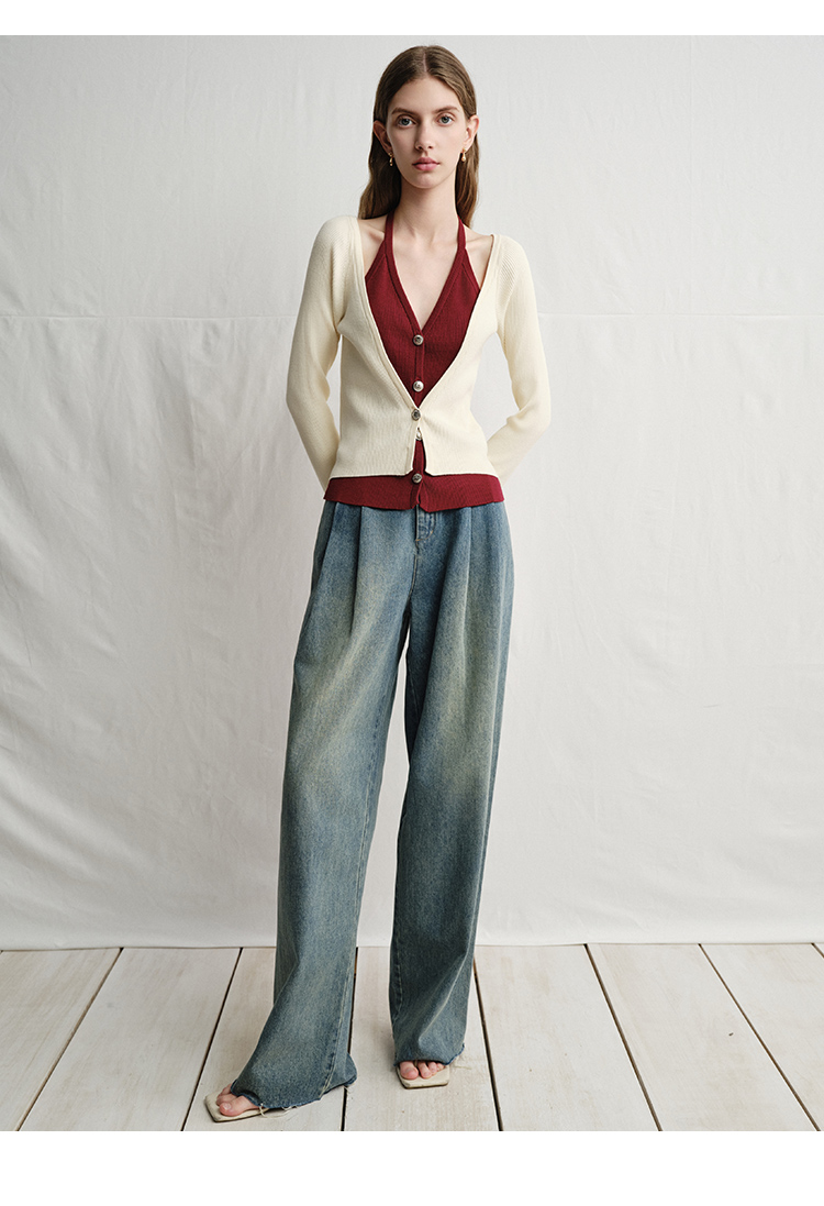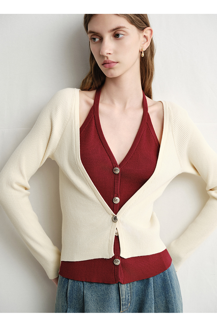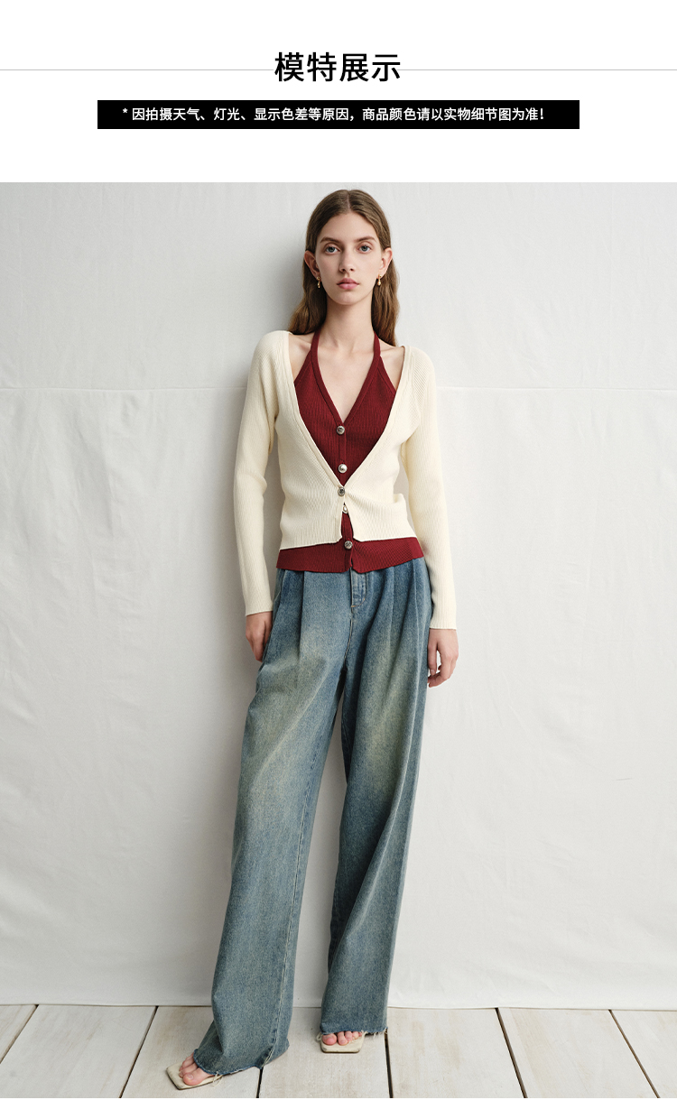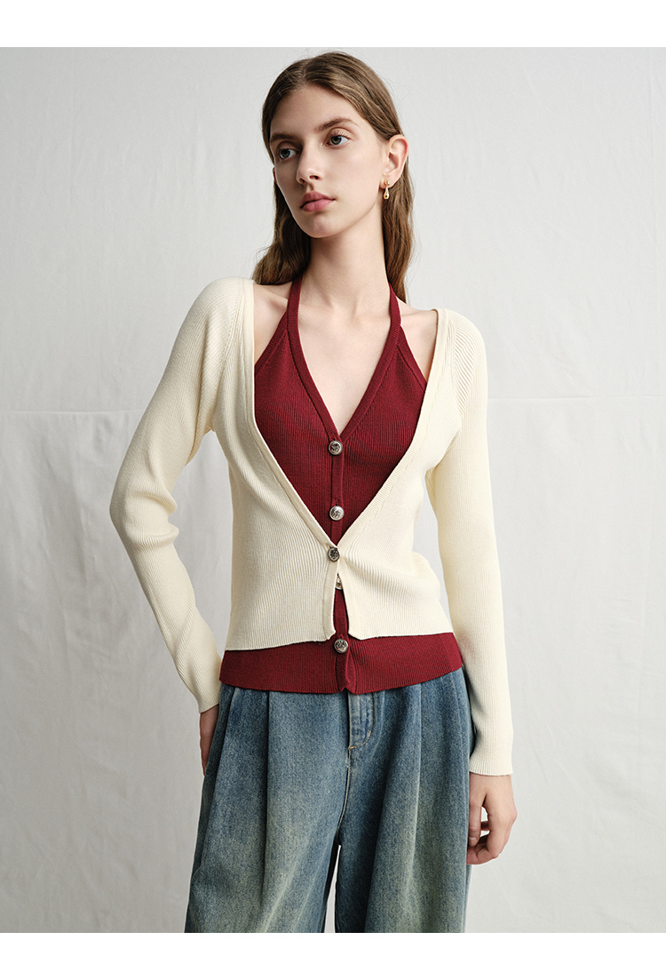 VIMAGE纬漫纪春季新款时尚撞色V领气质两件套针织衫V2301904