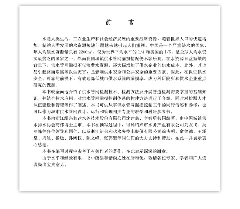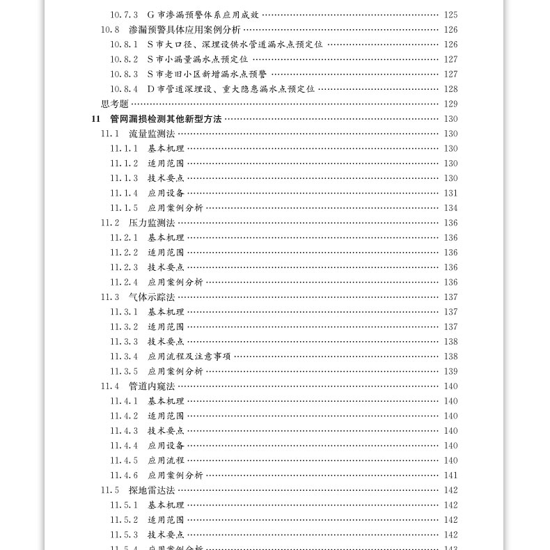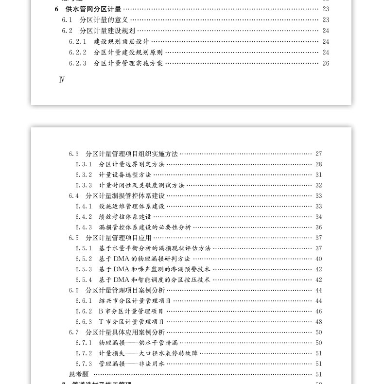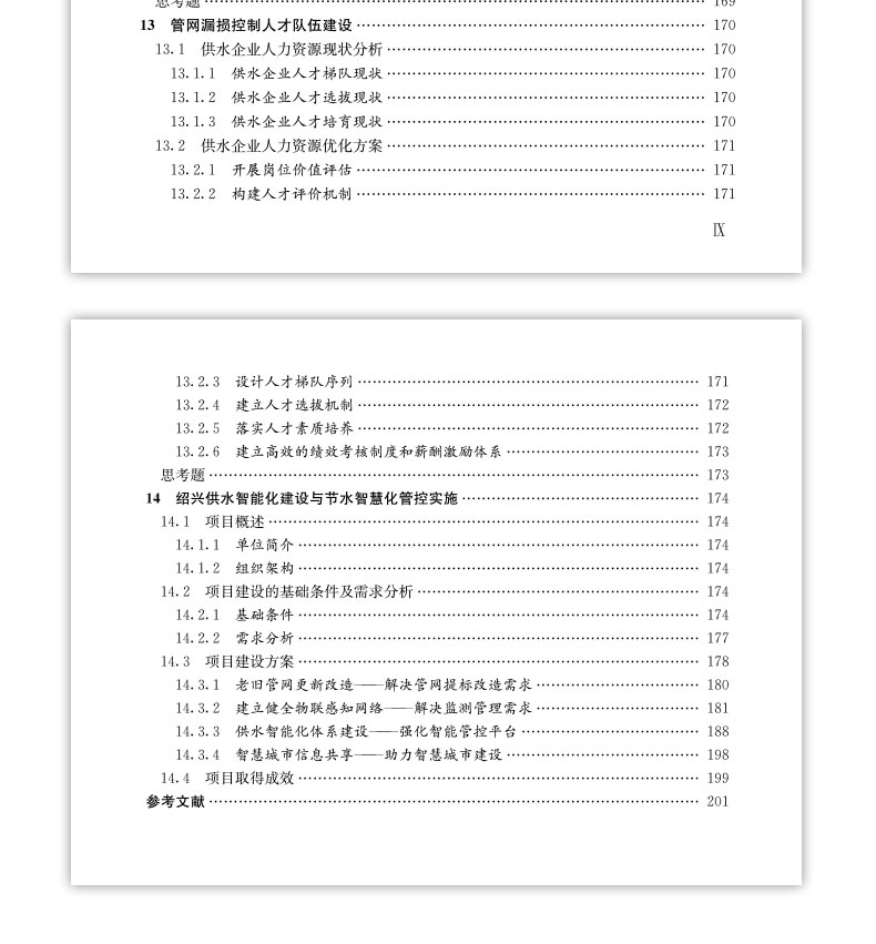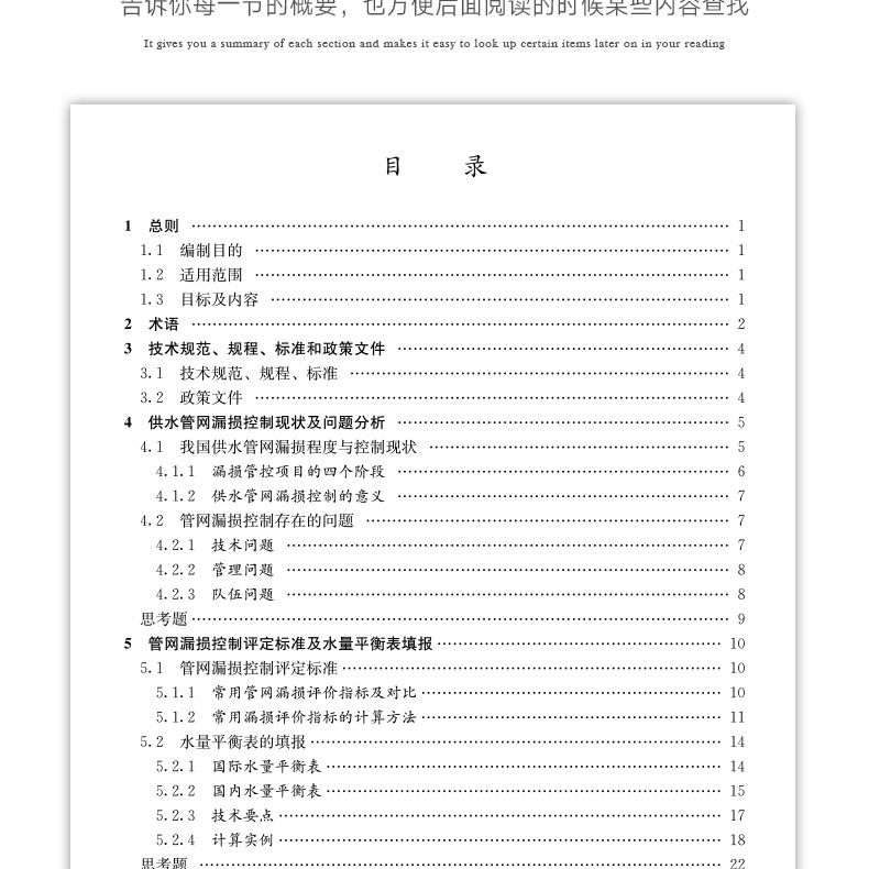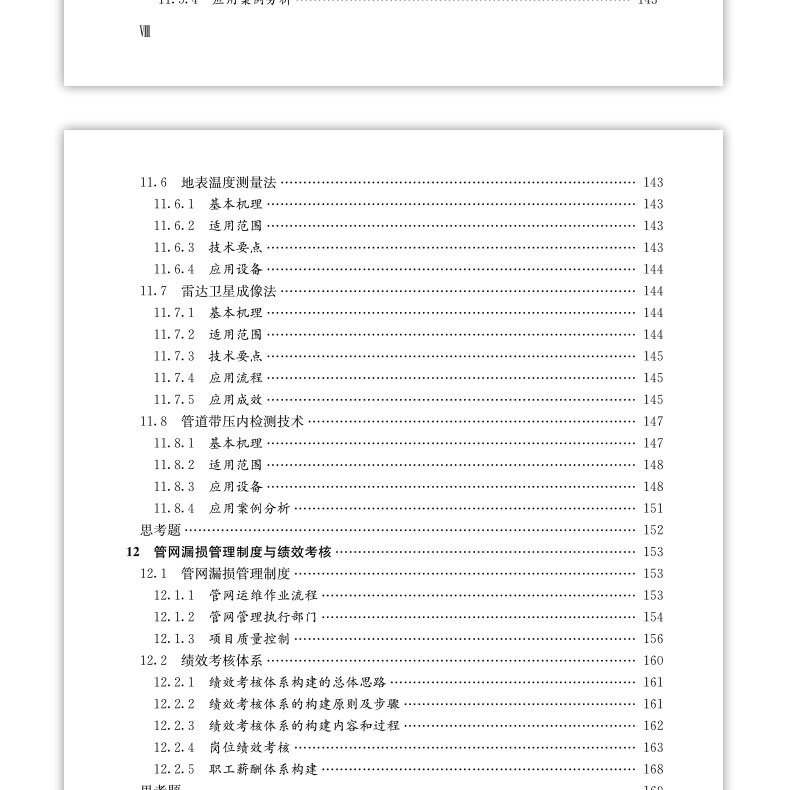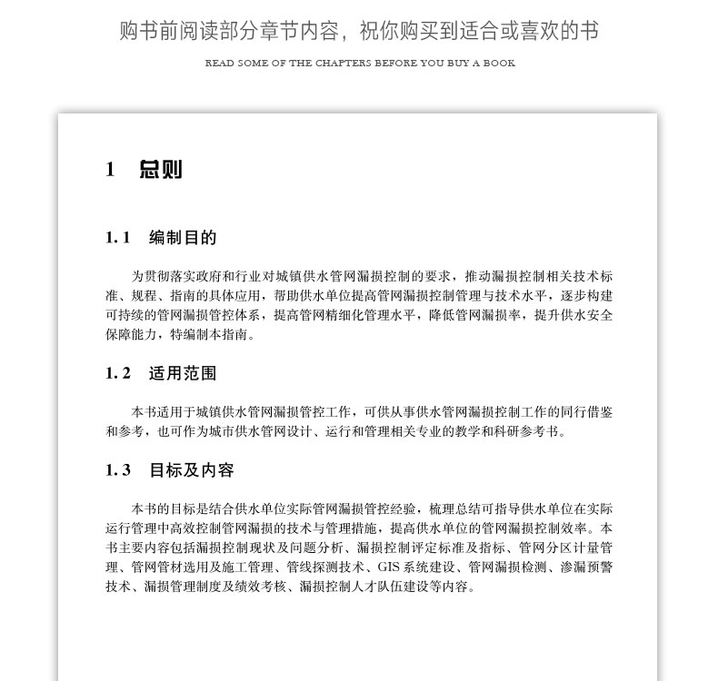 本书共有16章,主要内容如下: 第1章至第4章的内容包括前言、总则、术语、漏损控制技术规范、规程、标准和政策文件等; 第5章介绍了我国供水管网漏损控制现状,并从技术、管理、队伍三方面对存在问题进行了剖析; 第6章详细介绍了管网漏损控制评定标准; 第7章围绕分区计量,从建设、管理、应用三个方面,对分区计量体系进行了深度剖析; 第8章详细介绍了供水管网的管材选用及施工管理; 第9章详细介绍了管线探测的技术方法和GIS系统的构建; 第10章详细介绍了基于声音探测法的漏水检测技术; 第11章对基于大数据和云计算的噪音监测渗漏预警技术进行了深入介绍; 第12章详细介绍了国内外先进的其他新型漏损检测技术; 第13章阐述了漏损控制长效管理体系和绩效考核体系的构建和应用; 第14章介绍了漏损控制队伍建设、素质培养、人才选拔等人力资源体系建设和应用内容; 第15章结合绍兴市供水智能化项目案例,介绍了供水行业开展供水智能化建设和节水智慧化管控的实施方法和路径; 第16章为参考文献。
