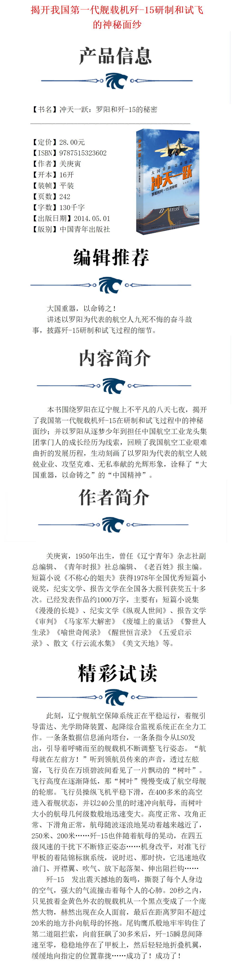 冲天一跃:罗阳和歼-15的秘密 关庚寅著 中国青年出版社