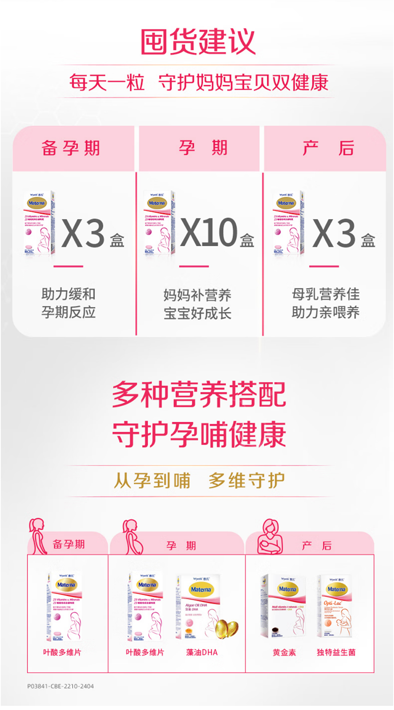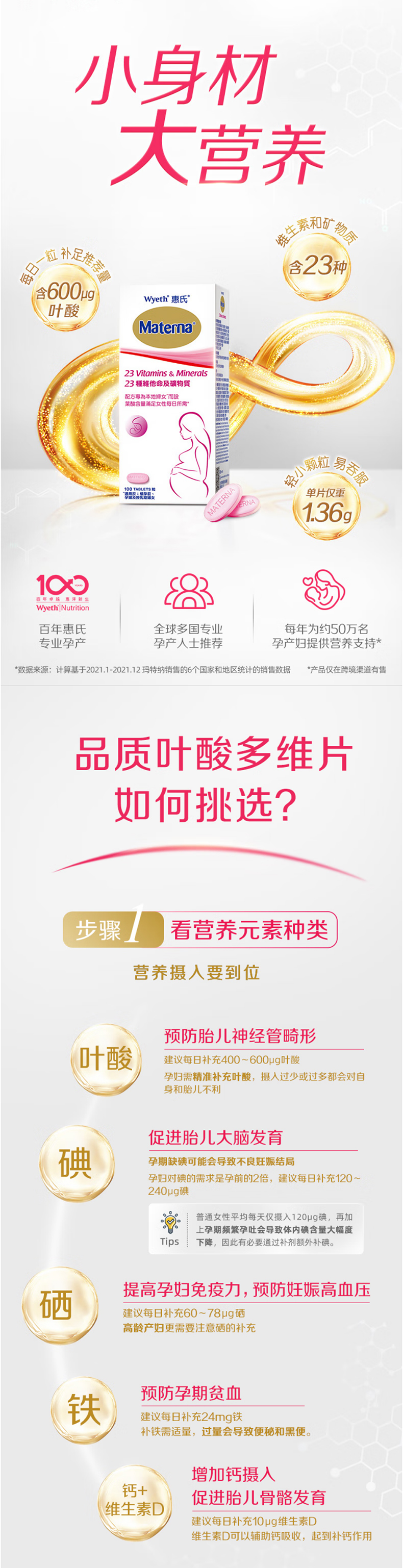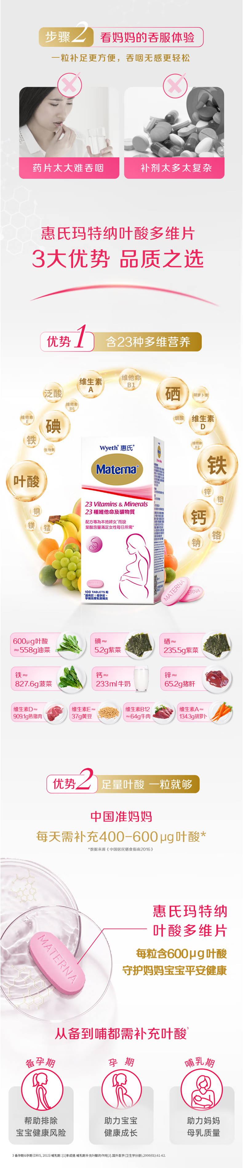 惠氏(Wyeth)玛特纳叶酸片备孕女复合维生素孕妇多维钙片营养元素补铁孕早中期营养品 100粒/瓶