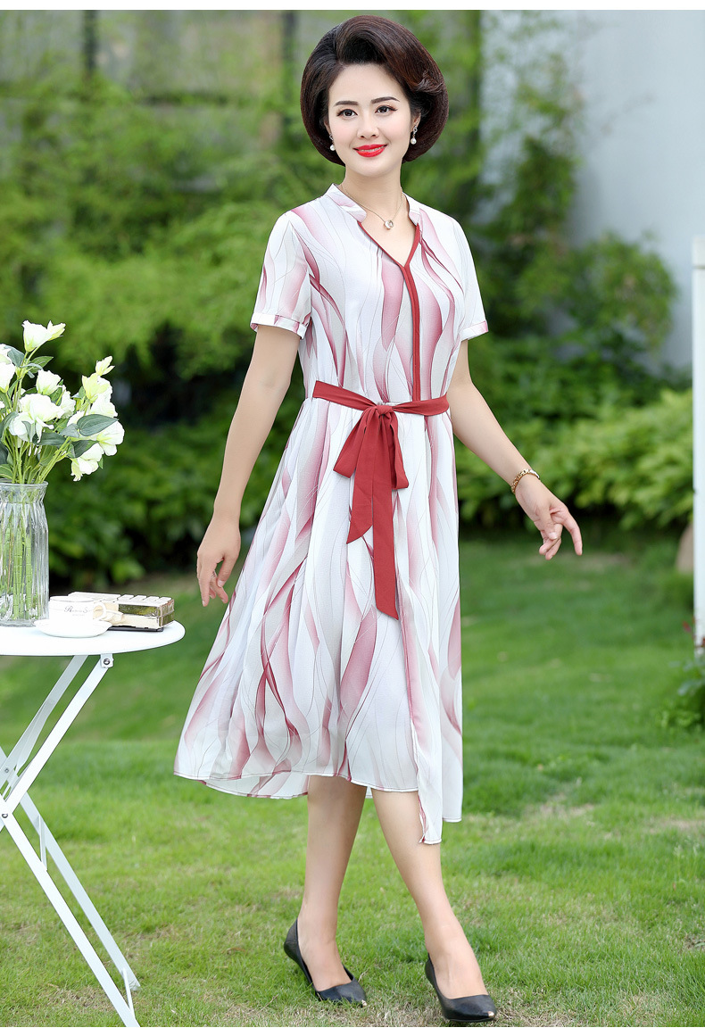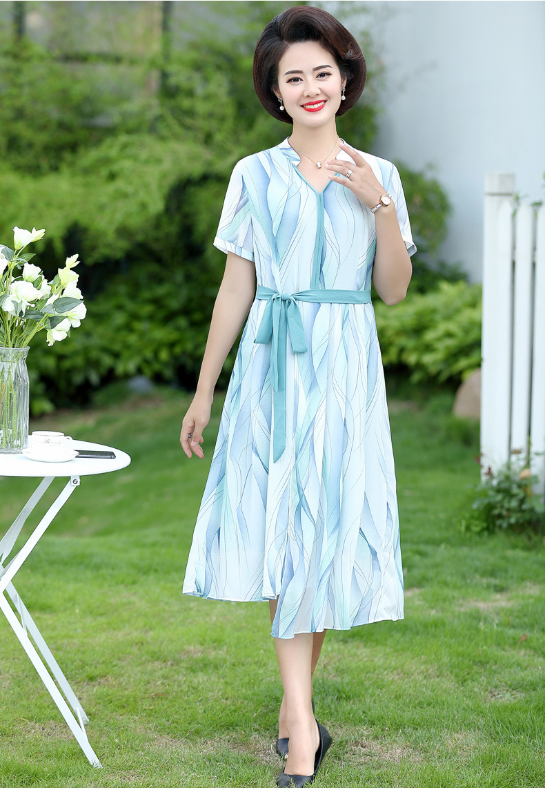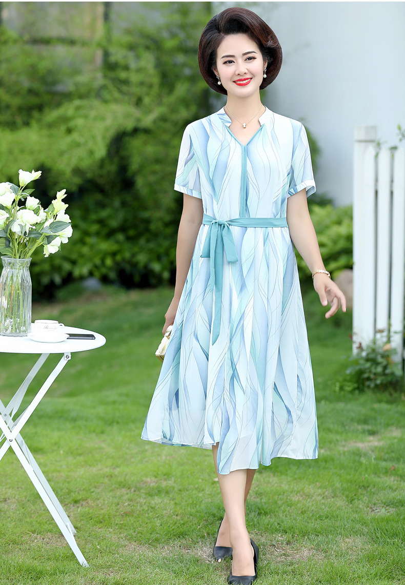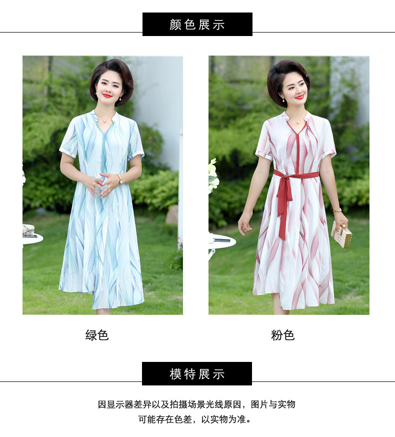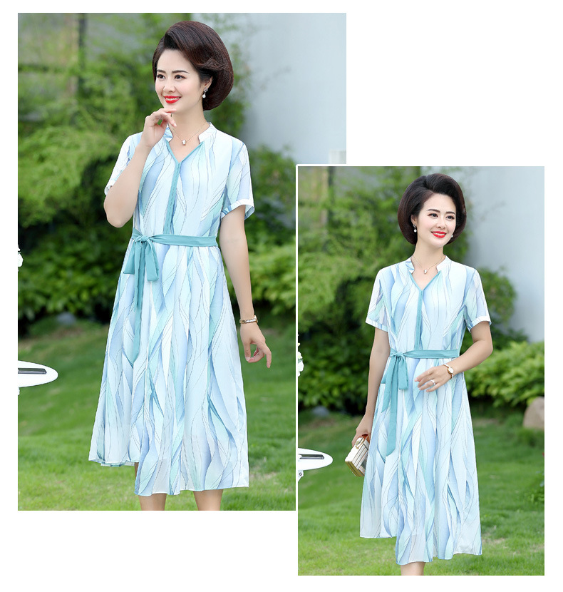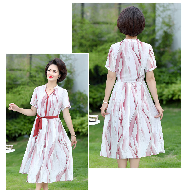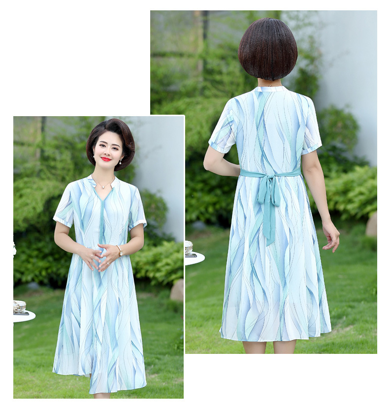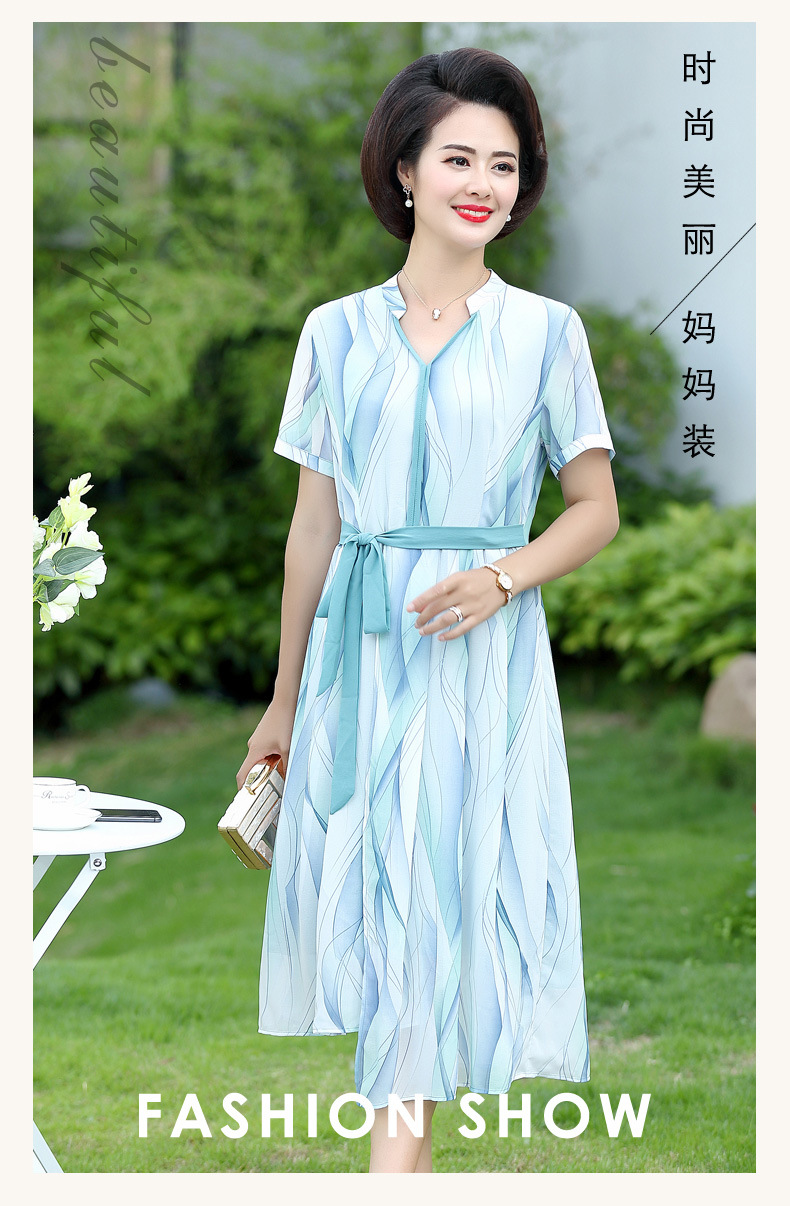 YMS-NAF9201妈妈雪纺洋气连衣裙新款中老年气质收腰过膝裙子