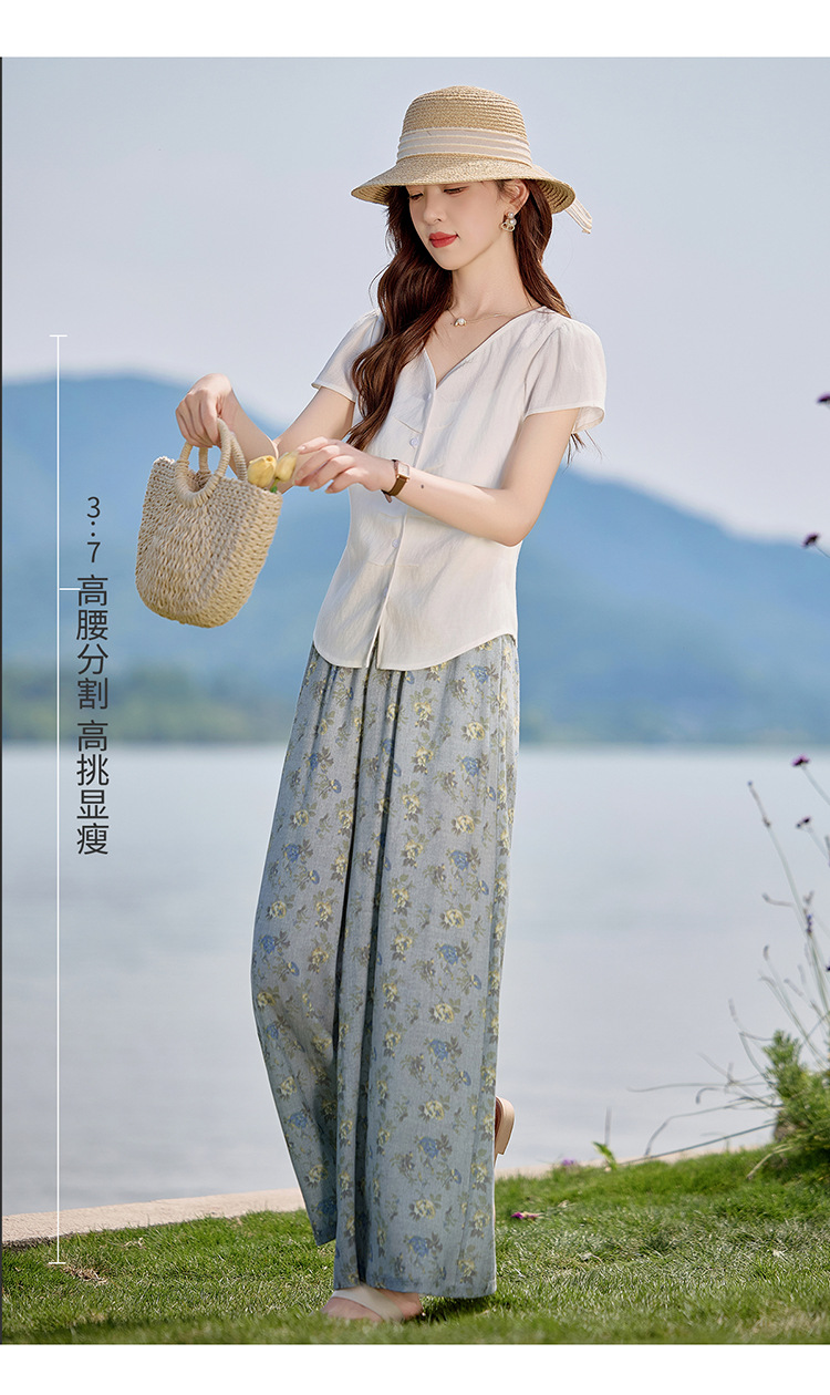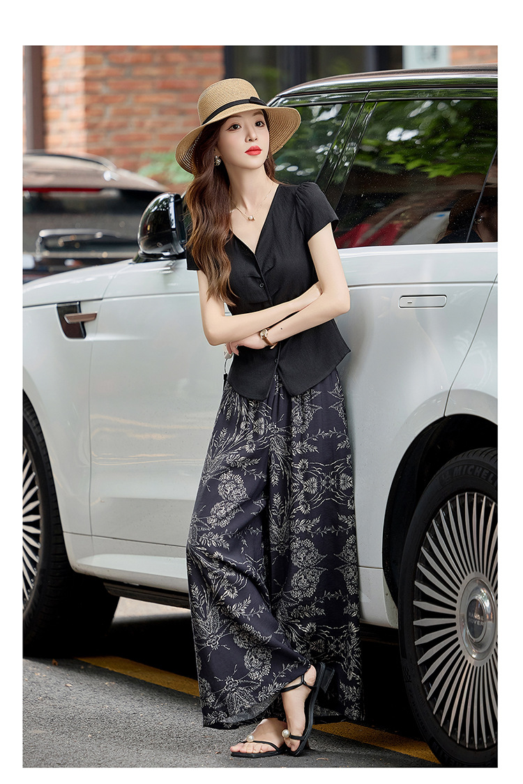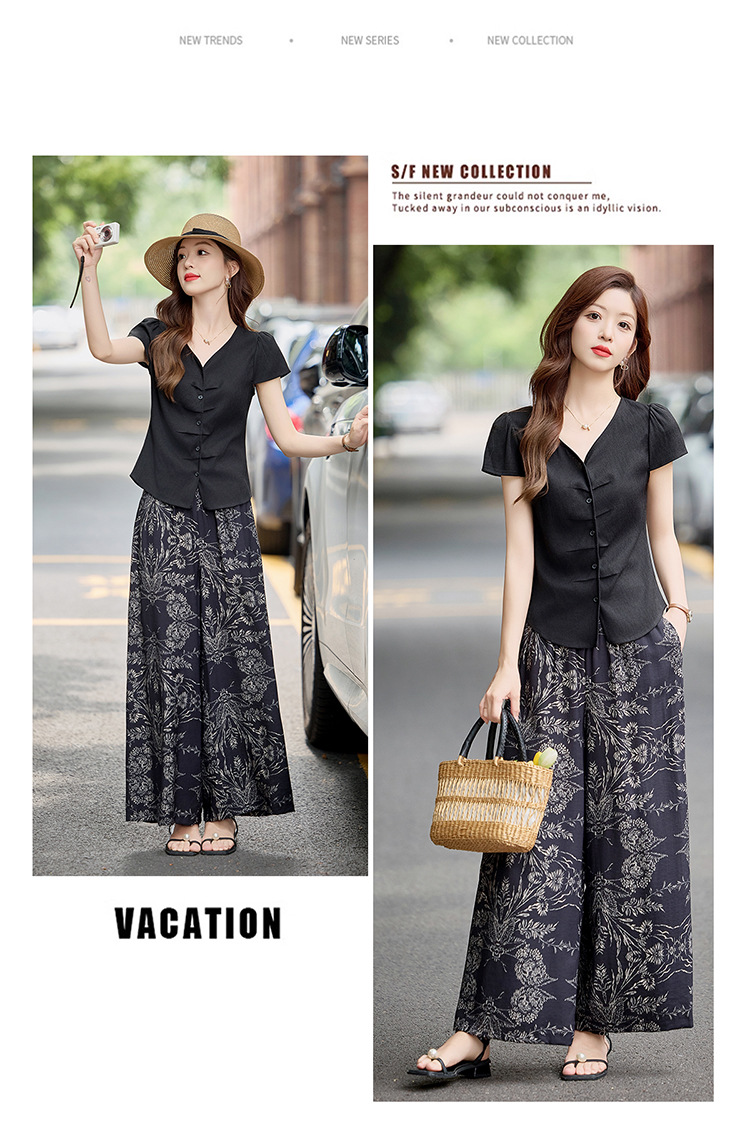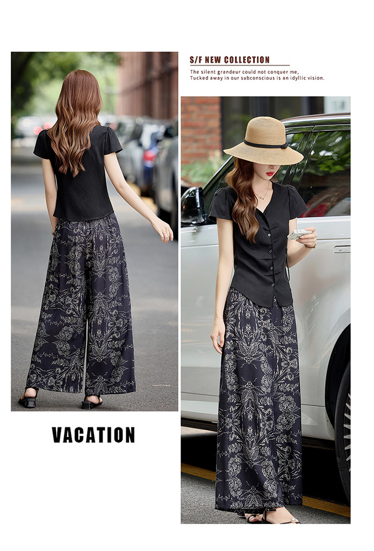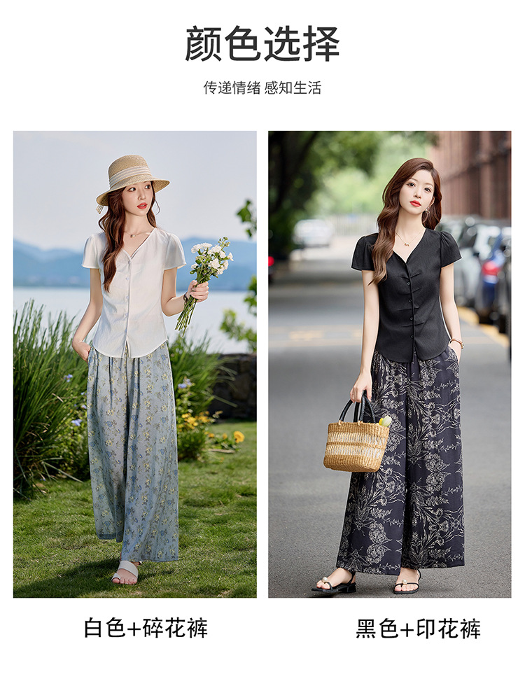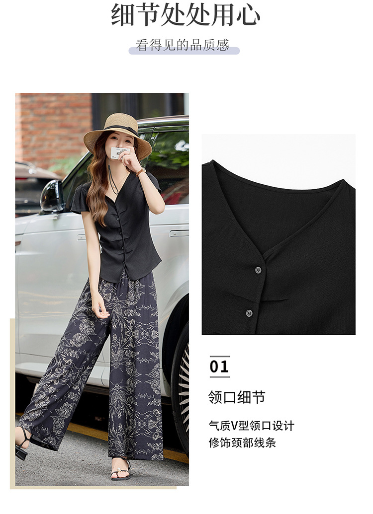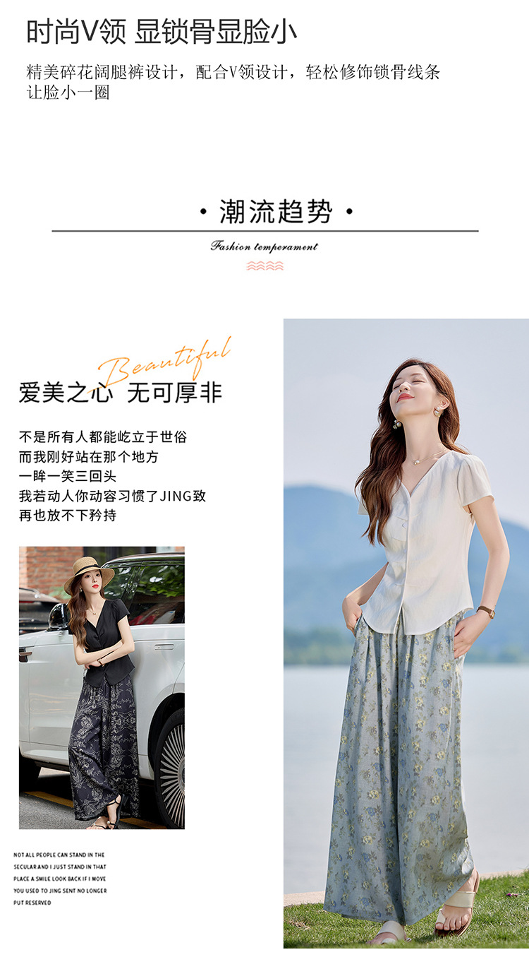 【预售3天】时尚休闲套装2025年夏季新款V领短袖上衣+花色阔腿裤两件套WWYG2532B