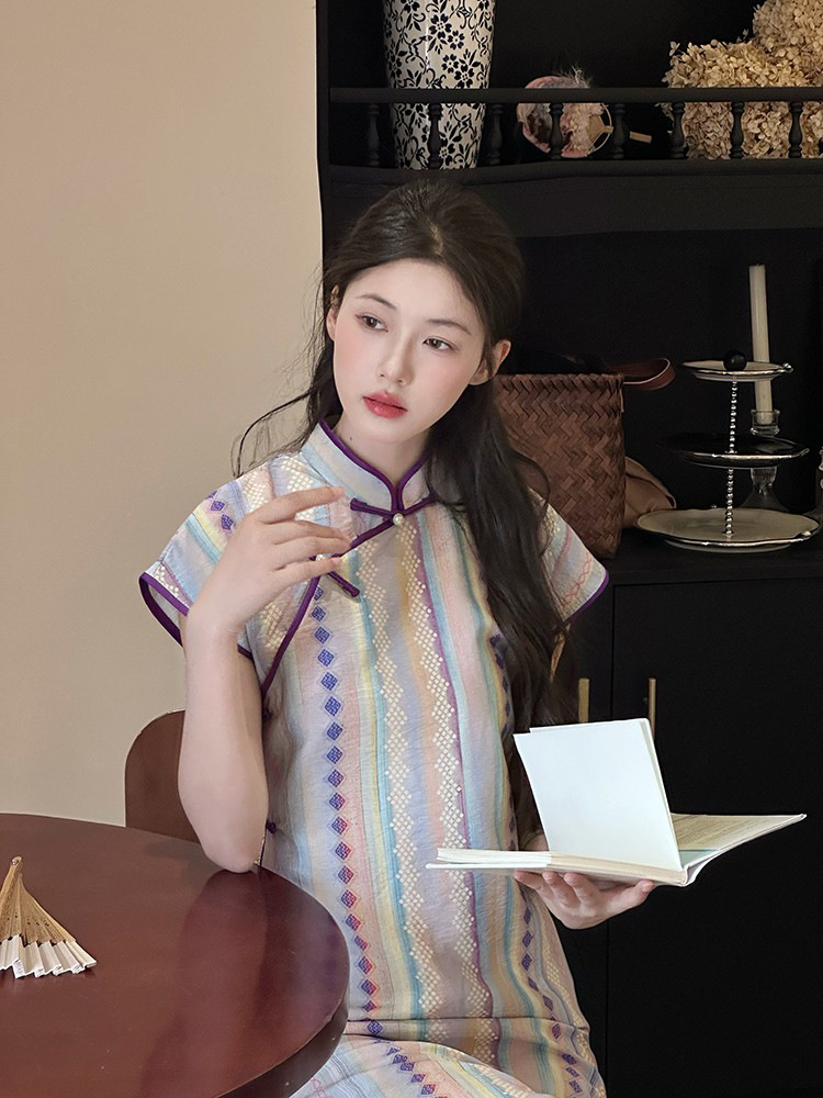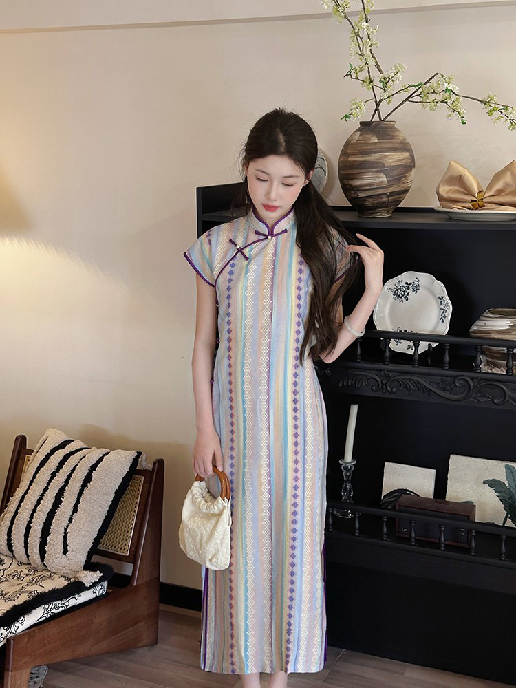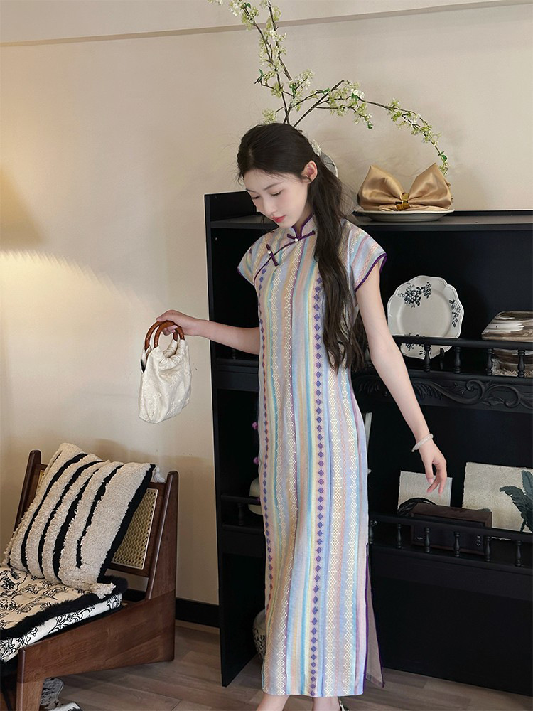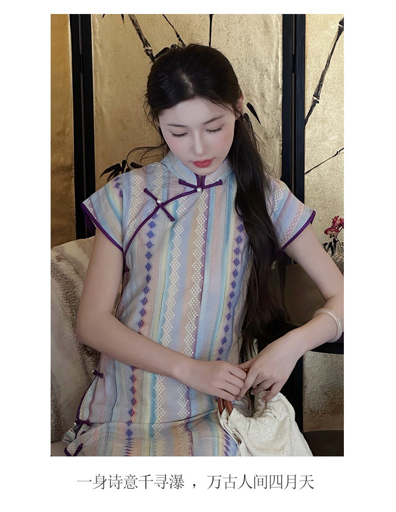 LSB3890古法旗袍全开襟竖条纹绝美新中式2025夏季新款文艺复古少女年轻款 商品图0