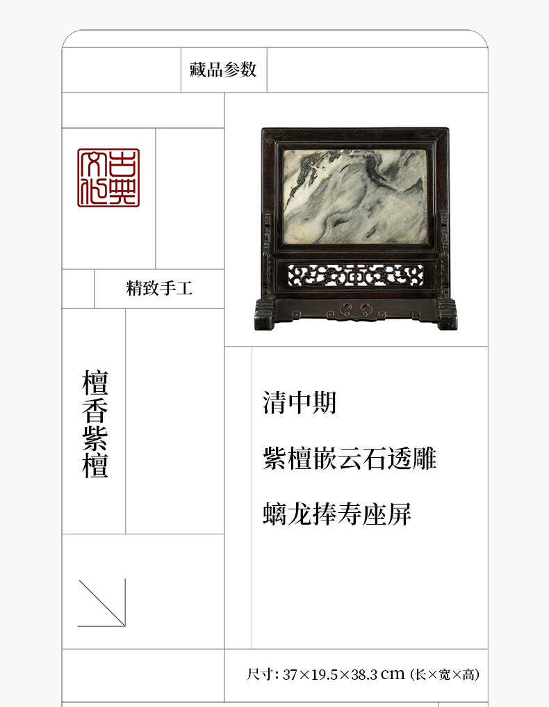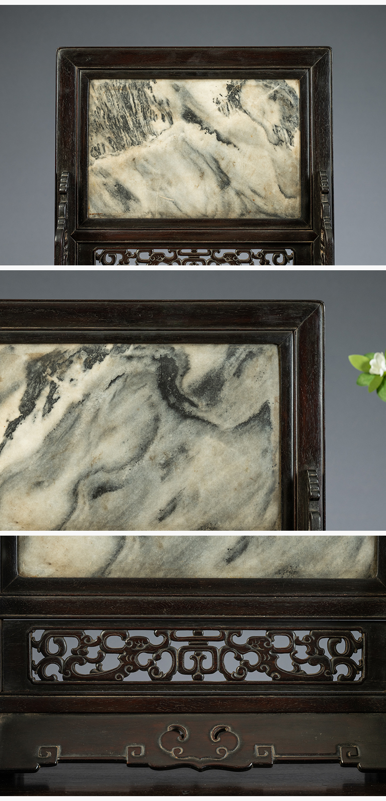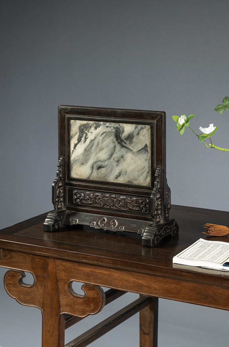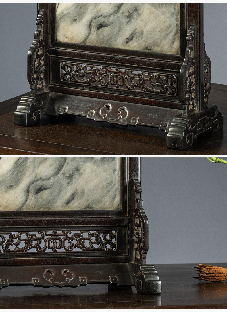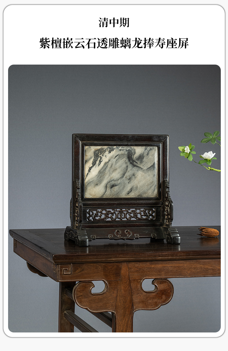 清中期 紫檀嵌云石透雕螭龙捧寿座屏