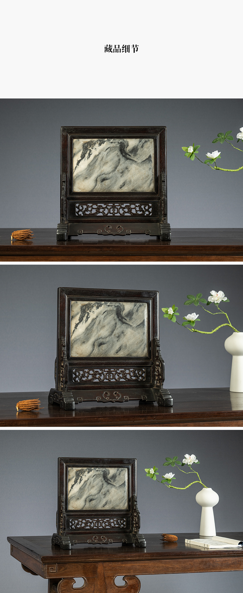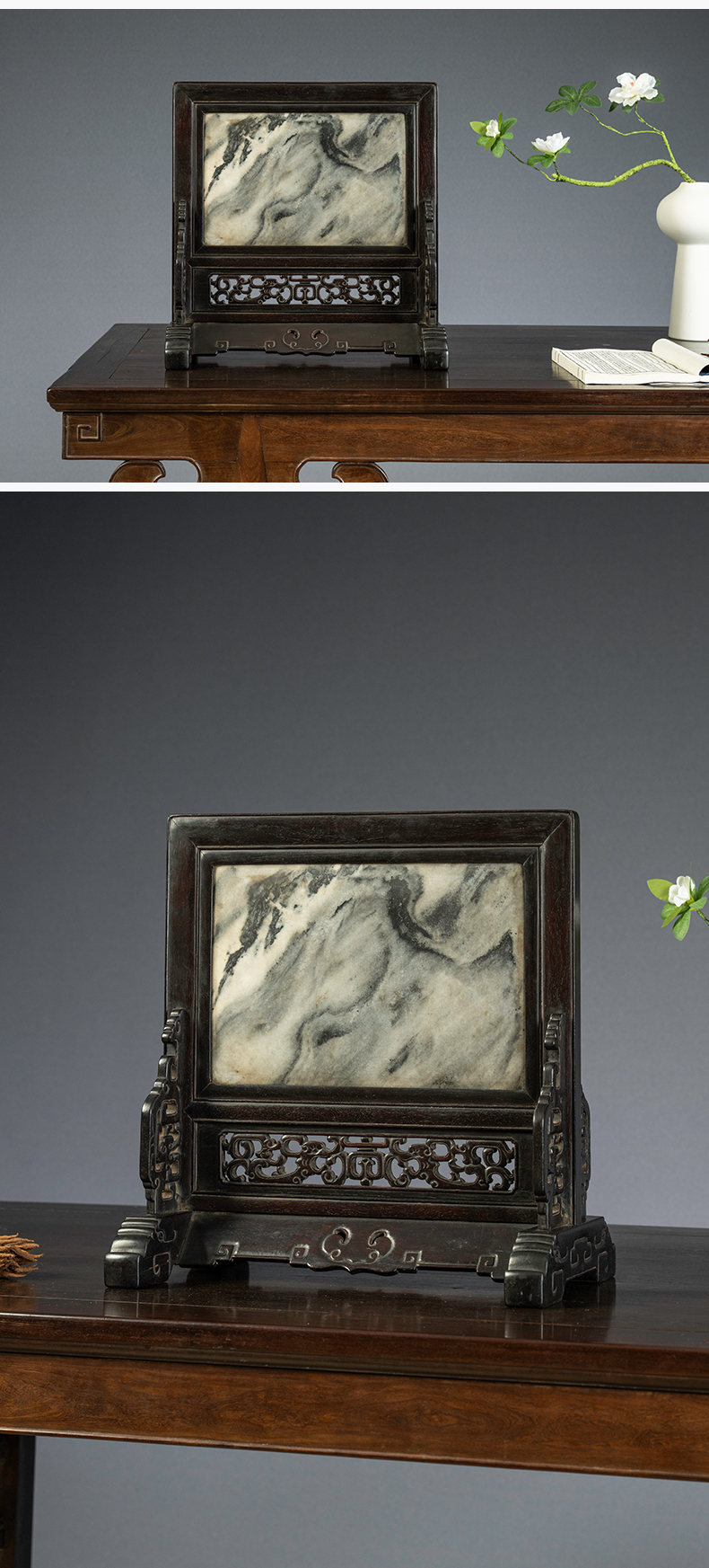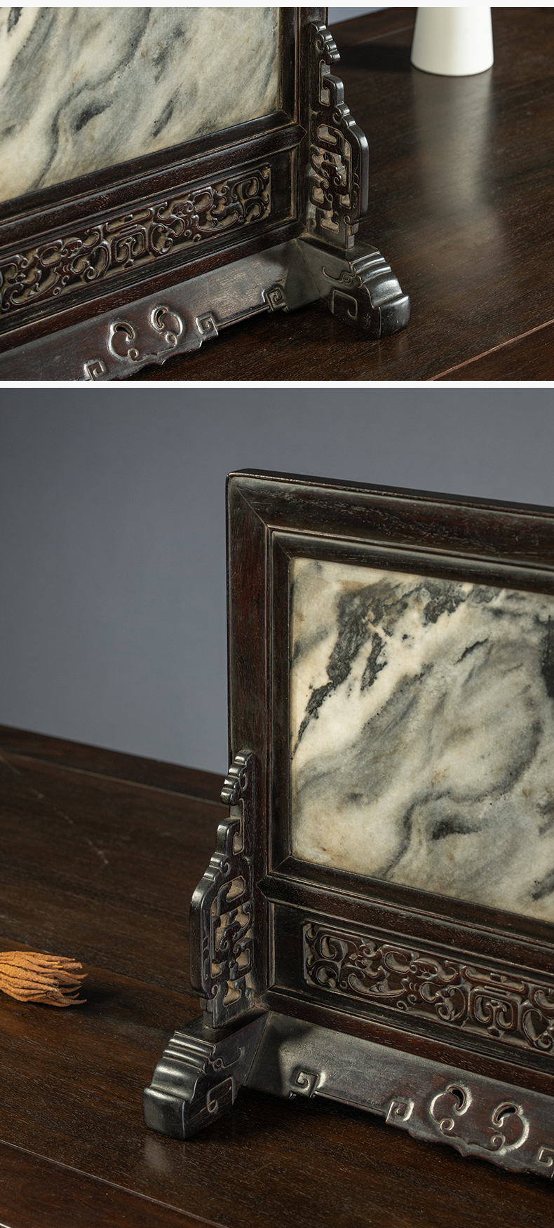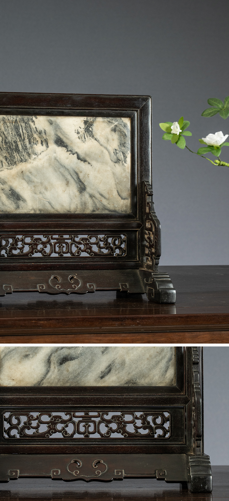 清中期 紫檀嵌云石透雕螭龙捧寿座屏
