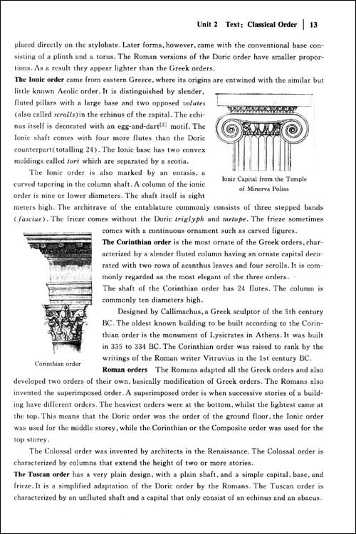 Unit 1 Text: Architecture Reading Material 1Architects in Practice Reading Material 2Professional Requirements in English Countries Unit 2 Text: Classical Order Reading Material 1Roman Arches Reading Material 2Greek Architecture and its Legacy in 20th Century American Architecture Unit 3 Text: Gothic Architecture Reading Material 1Rose Window Reading Material 2Gothic Dreamer Unit 4 Text:The Triumph of the Baroque Reading Material 1Illusionistic ceiling painting Reading Material 2Rococo Style Unit 5 Text:Modern Movement Reading Material 1The BauhausUnit 1 Text: Architecture