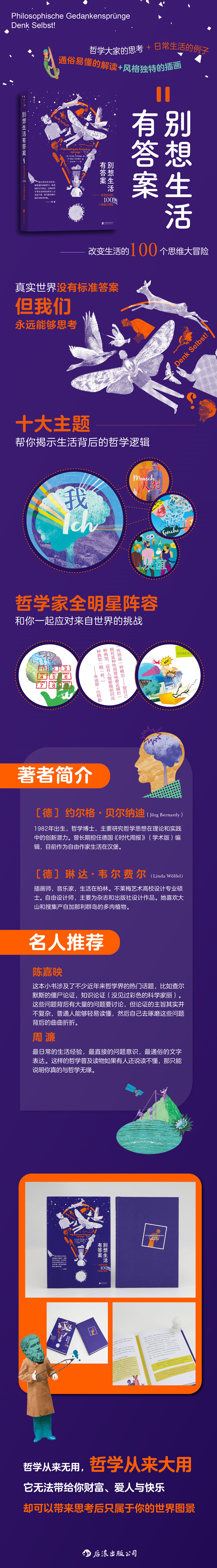 这正是本书作者约尔格·贝尔纳迪想要告诉我们的。他为我们在生活与哲学之间架起一座桥梁,帮助我们尝试用哲学的思维去思考日常的问题,不论是爱情还是友谊,自然还是社会,职业选择还是追求幸福,你都能在本书中看到哲学家对此的思考。这里并没有所谓的答案,只有问题和思考。毕竟生活就是如此,它只会给你提示,但不会告诉你该如何进行下去。幸运的是,生活接受一切答案,但前提是该答案必须是由你自己得出的。让本书给你的大脑一点点刺激,帮助你厘清思路,去构筑一个属于自己的世界。